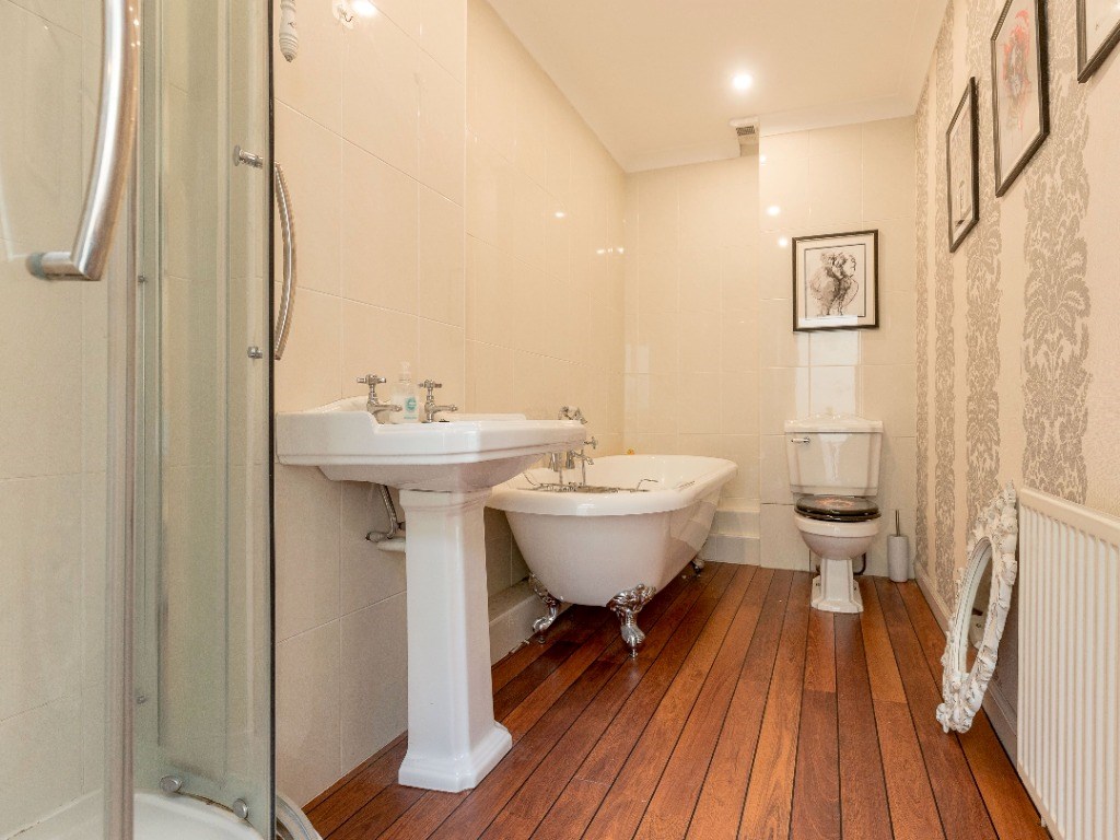 Next to the main bedroom is a large bathroom. This room blends old and new well, with modern spotlighting to keep the room bright and a roll-top bath to give it that period-appropriate feel. There is also a separate shower cubicle.