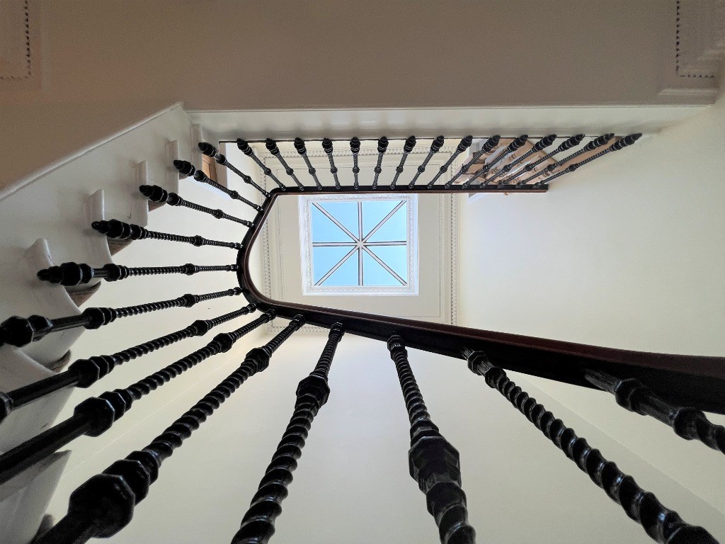 A curved staircase (still with its original bannister) leads to the upper level, with the impressive cupola flooding the stairwell with natural light.