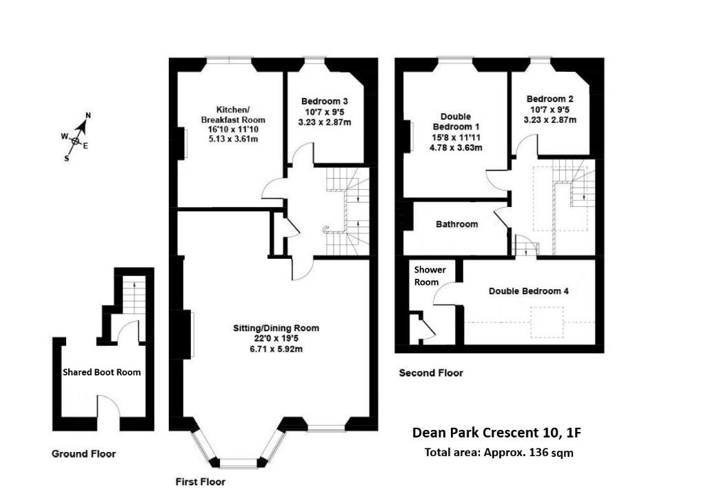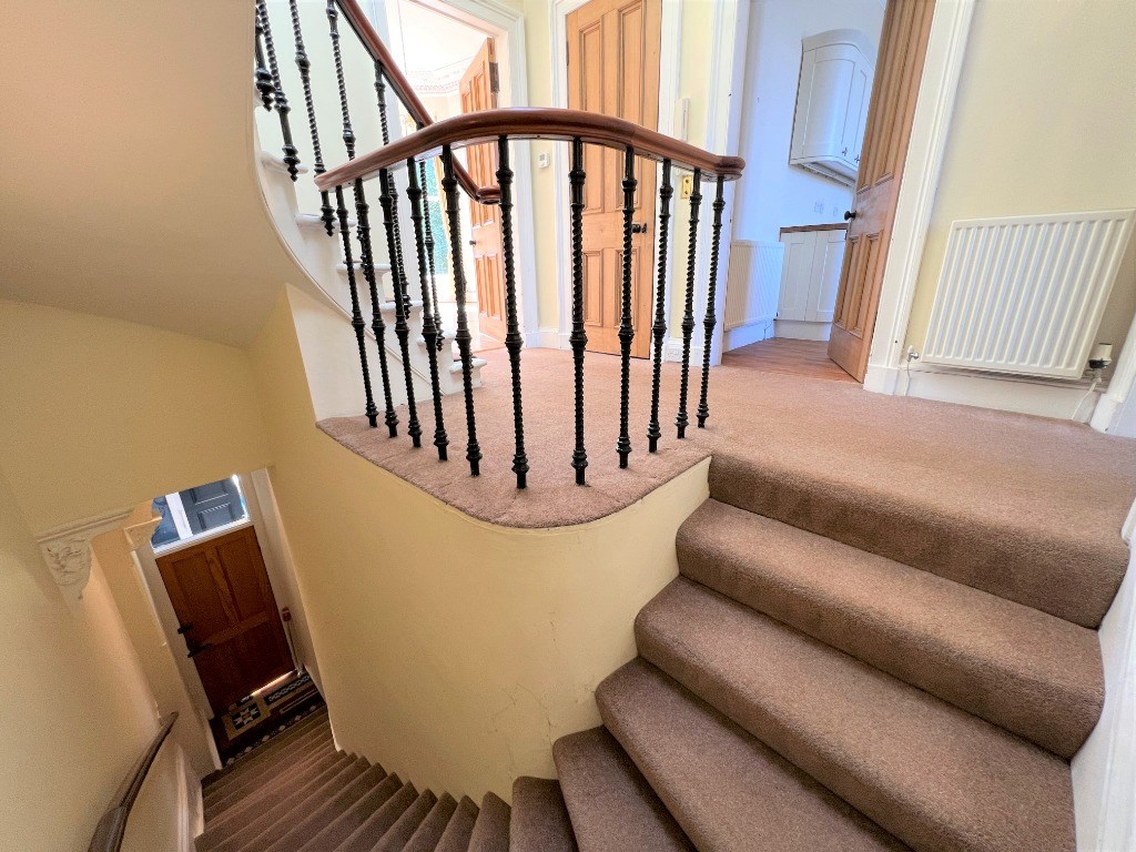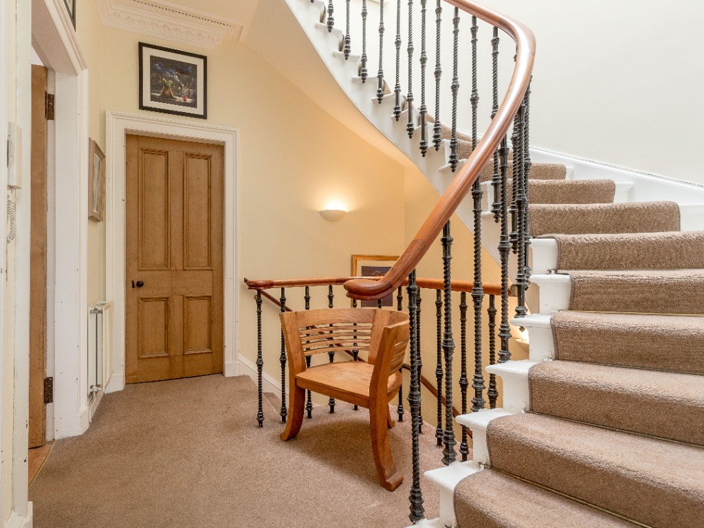 The property is accessed by a shared vestibule complete with high ceilings and original mosaic-tiled flooring. This leads to a carpeted stairway leading to the main landing on the property's first floor. This space gives access to the living room, dining kitchen and fourth bedroom.