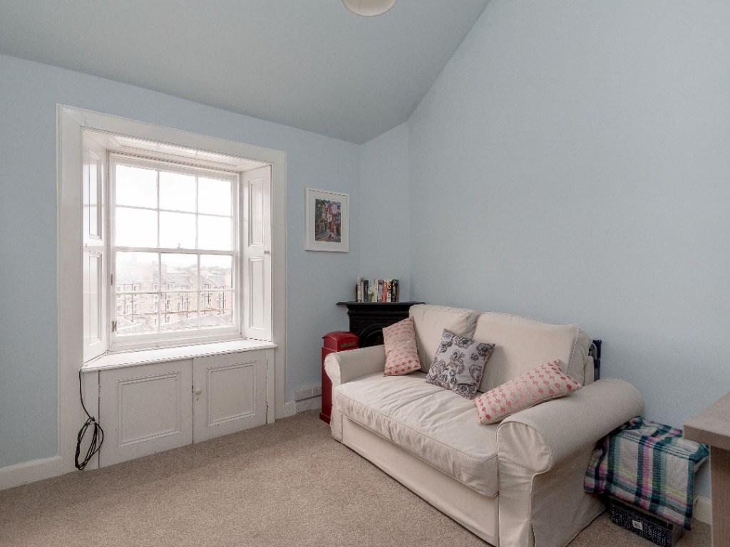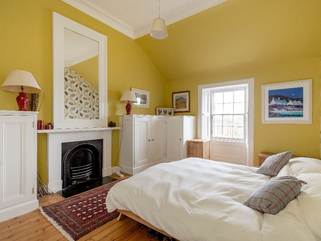 The first bedroom at the top of the stairs is a small, rear-facing small double or single. Given the number of power outlets in this room and the stunning views, it would make an excellent study or library. Its location next to the main bedroom also makes it a perfect walk-in wardrobe. Adjacent to this is the main bedroom, which offers ample fitted storage space. Both of these rooms have original working wooden shutters and offer extensive views across the city and northwards to Fife on the horizon.