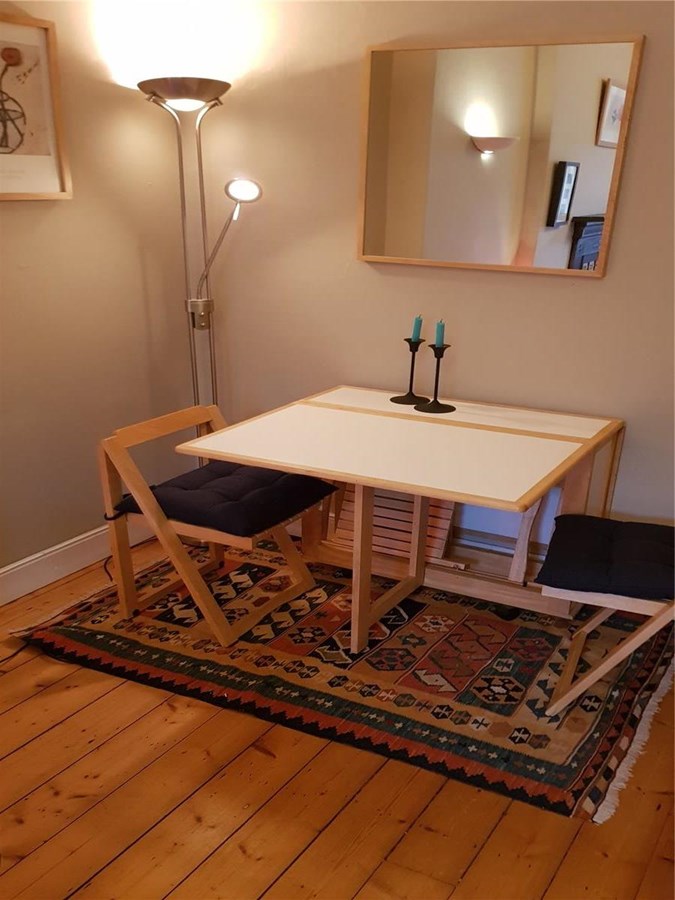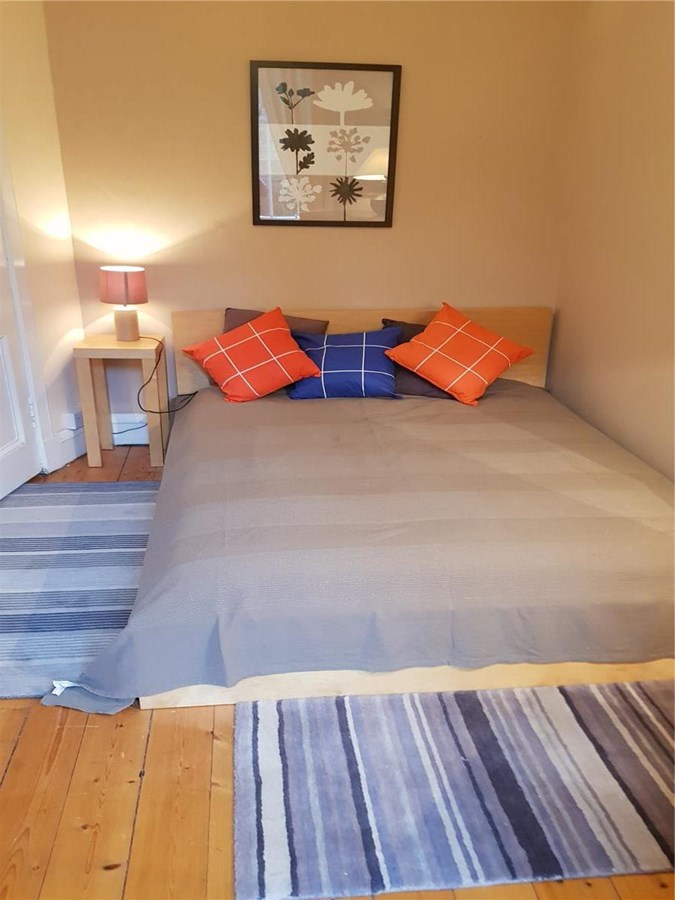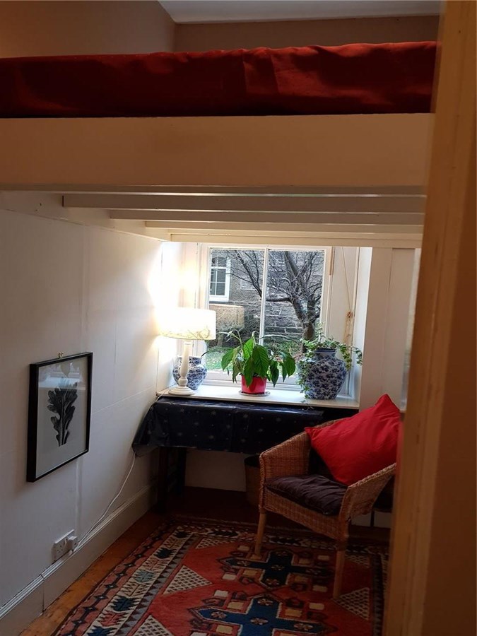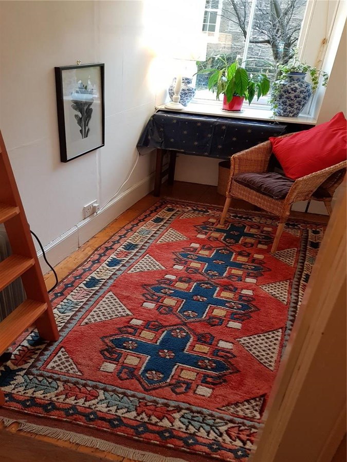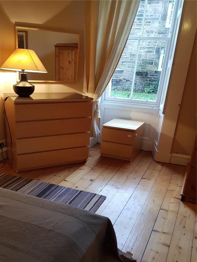 Comfortable, attractively-furnished one-bed ground floor flat in Stockbridge. Lots of original architectural features; wooden floors, shutters, fireplaces. Part double-glazing; Gas central heating; double bedroom with double bed, chest of drawers and wardrobe, spare room/study with double cabin bed; living room with coal effect fire. dining area with dining table and chairs. Well-equipped kitchen with gas hob and electric oven; washing machine, microwave, fridge, freezer. Shared access to sunny, quiet well-kept garden at rear of building. Secure Entryphone. Great location close to Stockbridge shops, cafes and restaurants; good bus links, walking distance from Inverleith Park and Botanic Gardens. Council Tax Band C (£2025.22 pa). Would suit professional or postgraduate single or couple. No smokers or pets. Available now.