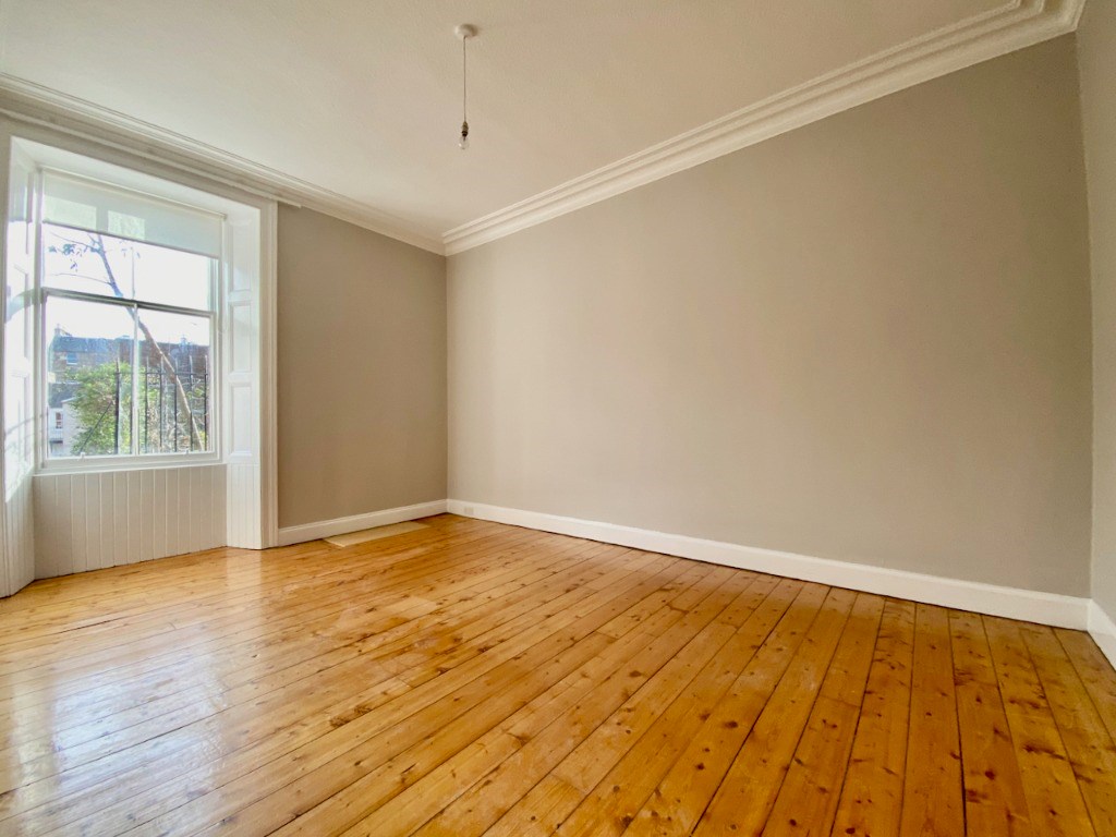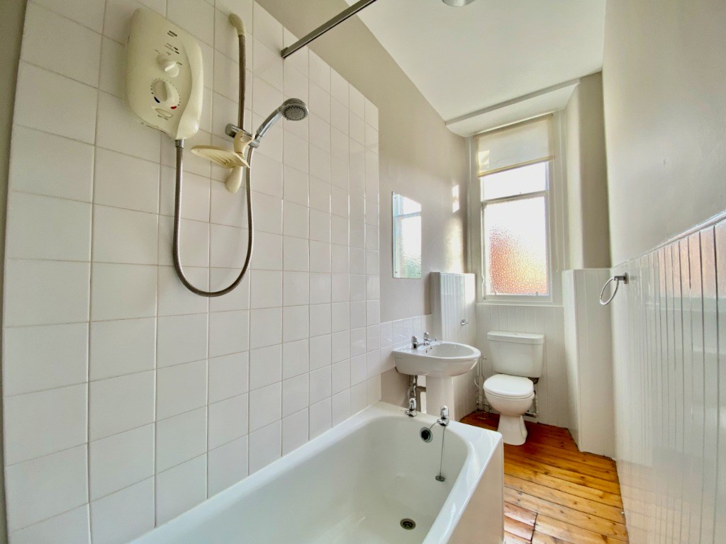 The spacious bedroom has a large bright window and the bathroom is complete with a bath and electric shower over.