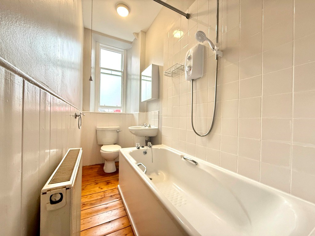 The spacious bedroom with large bright windows and the bathroom is complete with a bath and electric shower over.