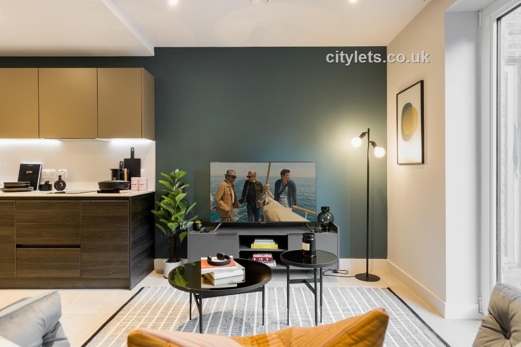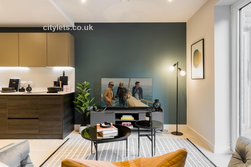Light and spacious with floor to ceiling windows and stylish herringbone blackout curtains. Plush deep-seated sofa, media storage unit and small coffee table with mirrored top.?