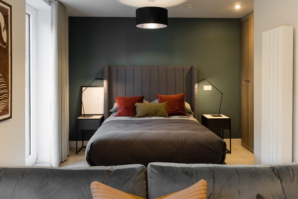 Stylish studio including bespoke fitted wardrobes with full height mirror, hanging rail and storage. Ottoman bed with storage, feature headboard and 1,000 individual pocket sprung mattress made from natural materials and marble effect bedside tables.