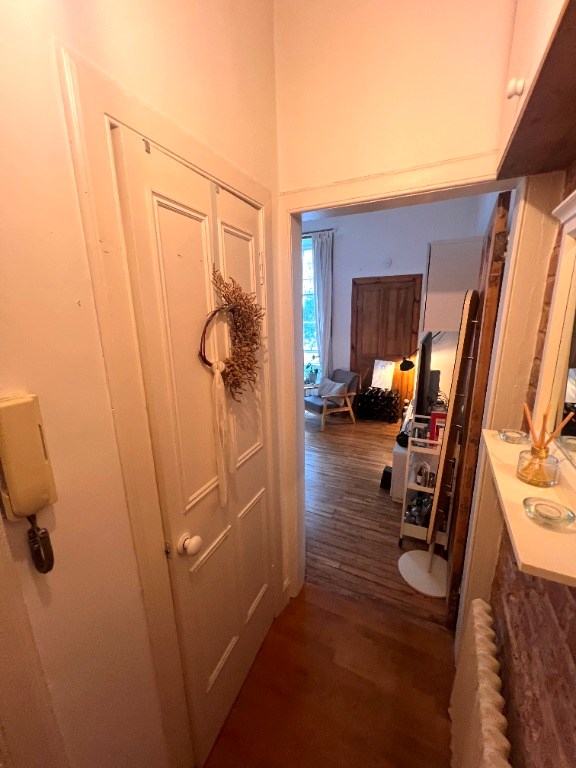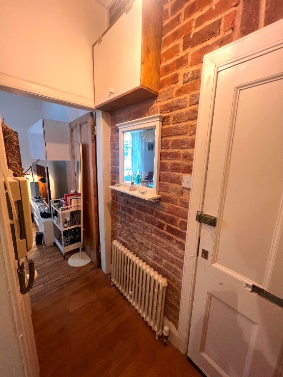 To the front of the property, the open-plan living and kitchen area benefits from plenty of natural light and offers pleasant views over the communal front garden. The space is tastefully decorated, featuring a blend of contemporary finishes and charming details such as exposed brickwork in the lounge, kitchen, and hallway. Gas central heating and quality wooden flooring further enhance the warm and inviting atmosphere throughout.