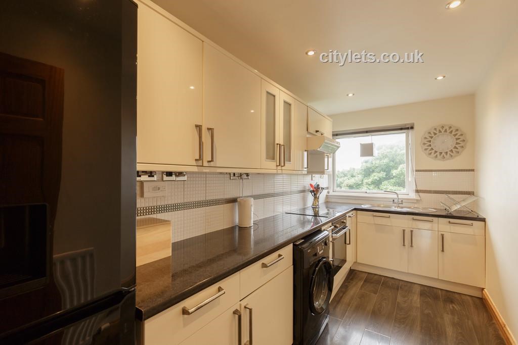 KITCHEN Modern kitchen with a wide range of appliances and an electric oven. The room is equipped with white gloss base and wall units and black counter tops.