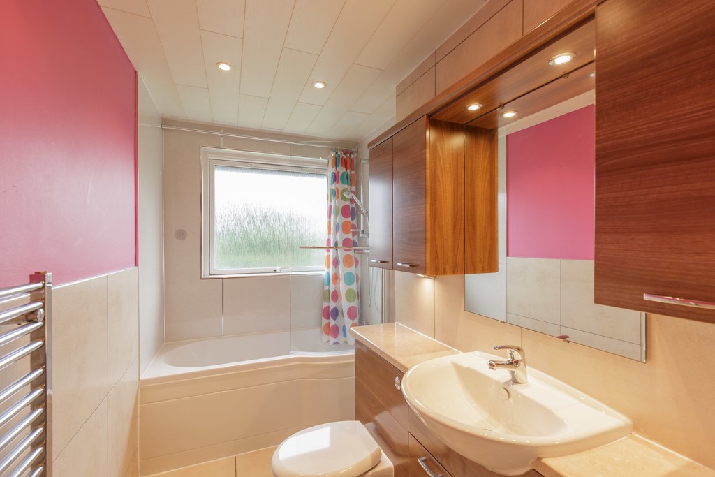 BATHROOM Newly renovated bathroom with a white three piece suite with a shower over the bath. Easy to maintain and complementary colours.