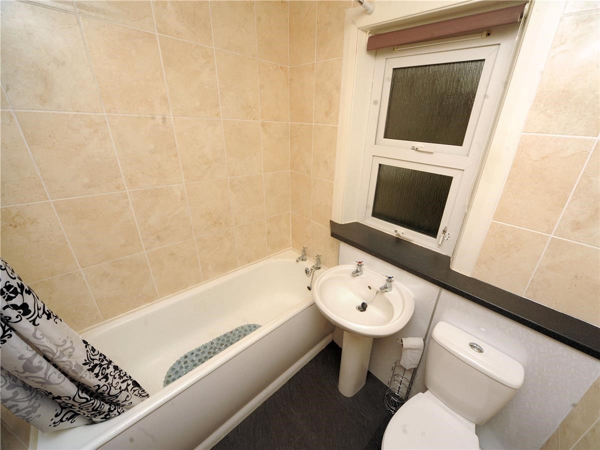 The kitchen has been fitted with a good range of base and wall units in a white finish with complimentary grey worktop surfaces. Fresh decor, light wood laminate flooring and a large window overlooking the rear make for a bright and airy room. Appliances include electric cooker with oven and hob, washing machine and fridge. Space is provided for a small table and chairs or an additional appliance as desired.