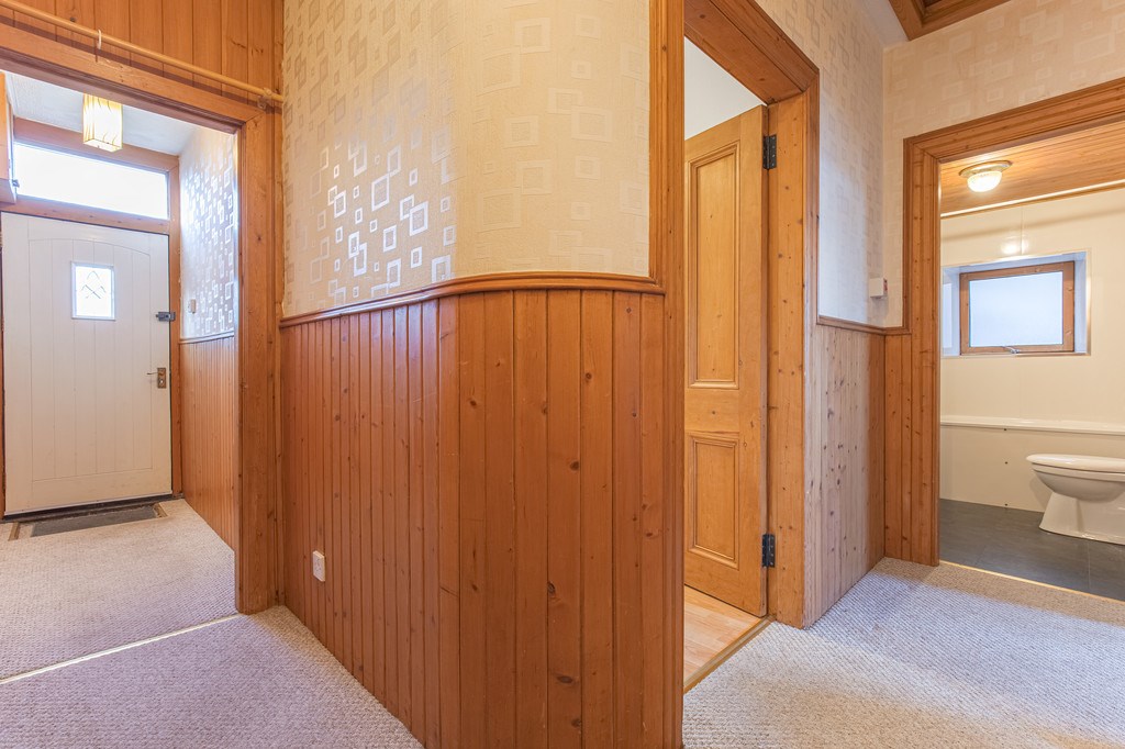 HALLWAY The hallway offers a warm first impression with its wood-panelled lower walls and neutral décor. The area is well-lit and provides access to several rooms, including the bathroom, bedroom, and main living spaces. A combination of carpet and laminate flooring helps define the flow of the home.