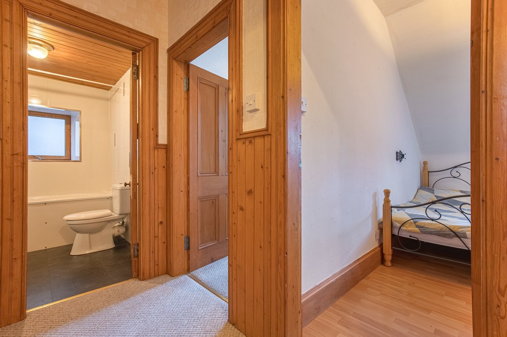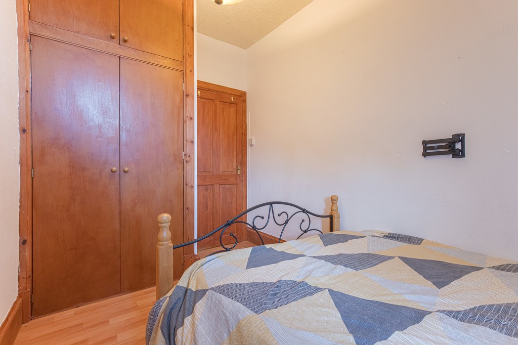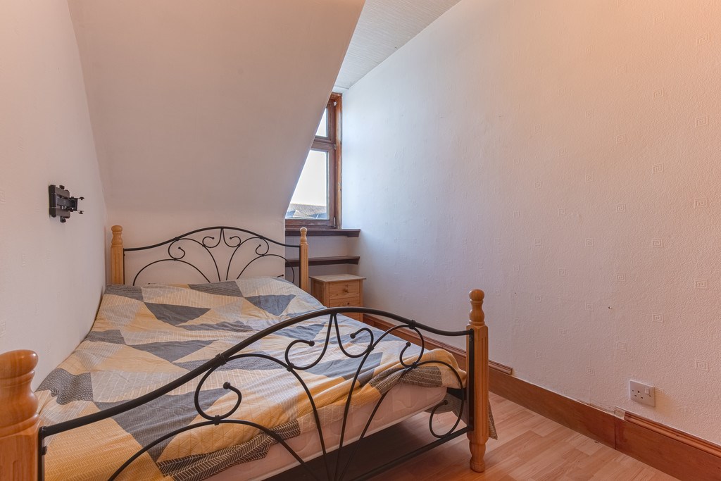 BEDROOM A cosy, compact bedroom featuring a sloped ceiling and a window that brings in natural light. The room includes built-in wooden wardrobes for convenient storage and a decorative metal bed frame. Light laminate flooring and neutral walls make it easy to personalise the space.