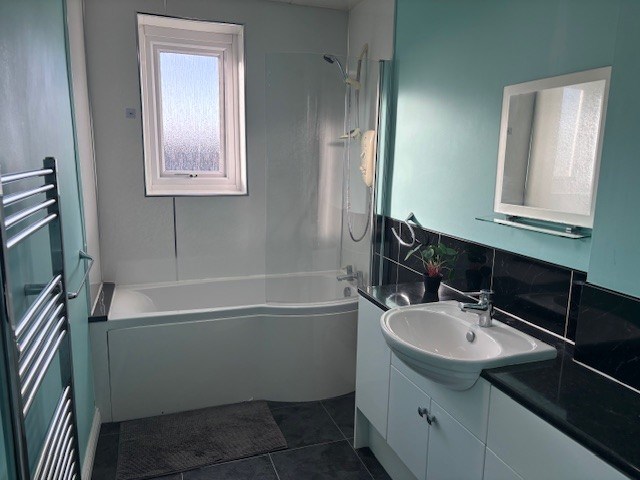 BATHROOM: (13’2" x 5’7" approx) Striking bathroom fitted with a modern white 3-piece suite comprising: wc with recessed cistern, and counter-sunk wash hand basin with chrome mixer tap, both contained within a white vanity unit with black counter top and tiled splashback; and shower bath, above which is a Mira Sport electric shower and glass door. Wet-wall panelling around the bath area. Chrome ladder style radiator. Chrome towel rail and co-ordinating accessories. Wall mirror and glass shelf above wash and basin. Chrome spotlight track. Slate effect laminate flooring.