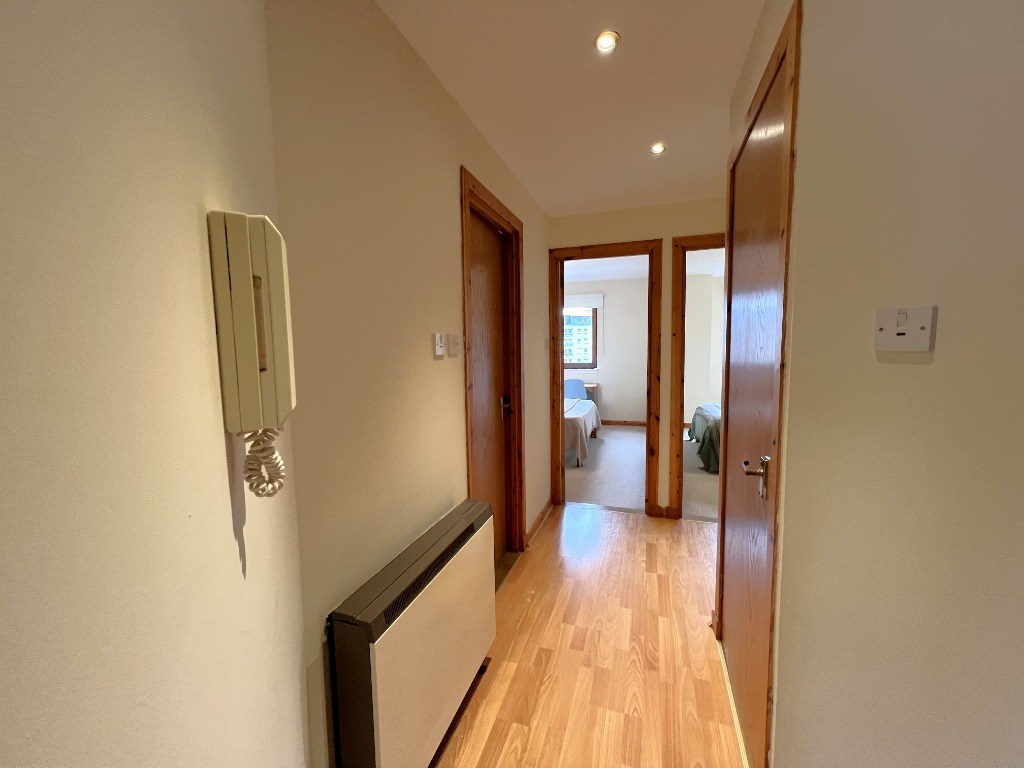 The hallway connects the bedrooms to the bathroom and living space. It has coat hooks and a large linen cupboard with shelving.