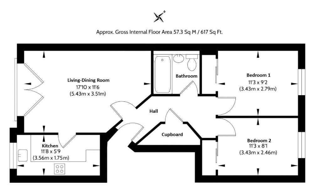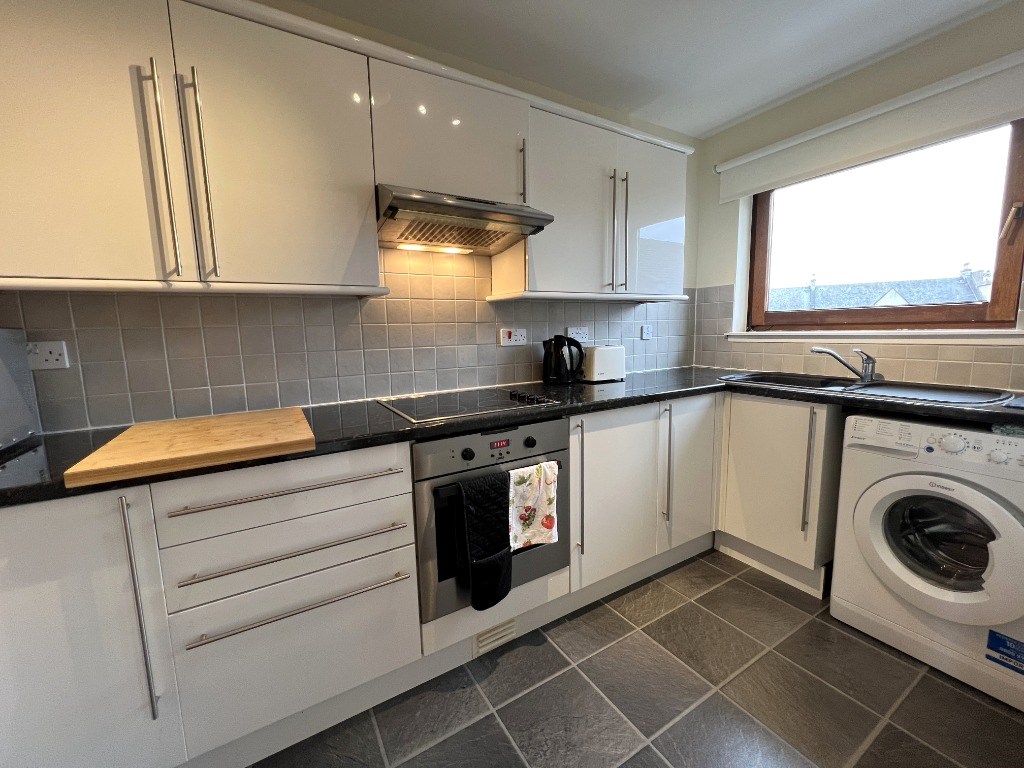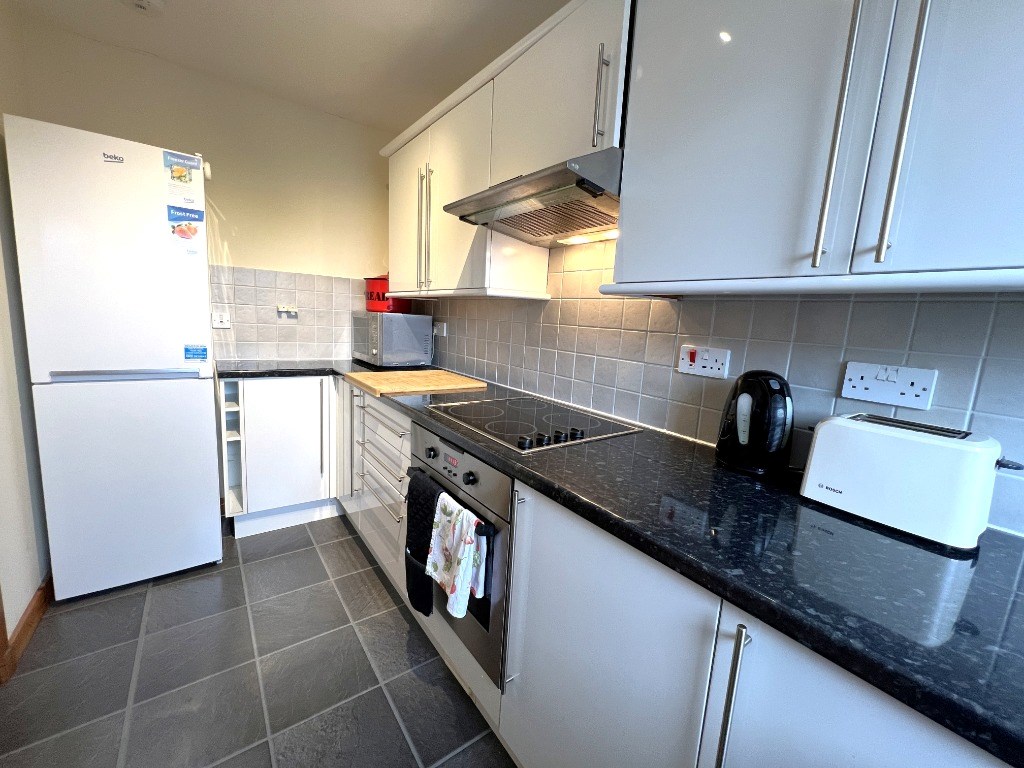 Off the living-dining room is the kitchen. This has a sleek, modern feel and comes with plenty of cupboard and worktop space. The kitchen includes all the appliances you would expect in a furnished let, such as a washing machine, a kettle, a toaster, an electric hob and oven, a microwave and a freestanding fridge-freezer.