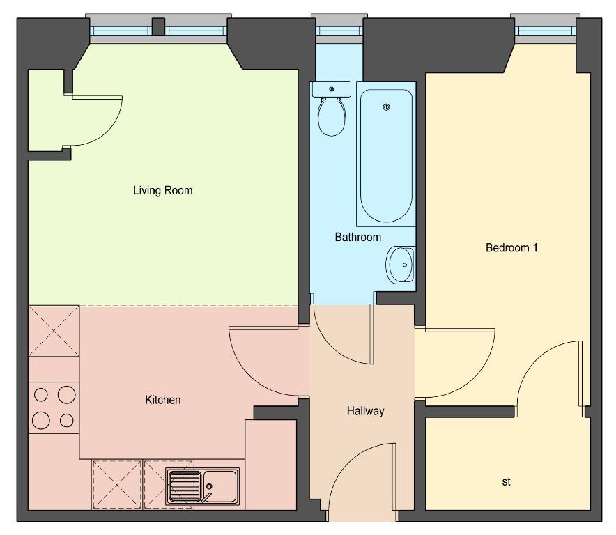 This property is located within a red sandstone building, occupying a ground floor position. Upon entering the property you are greeted by a welcoming hallway, to the left of the hallway is the open plan kitchen/living area, including kitchen with high gloss units and modern appliances. Straight ahead of the hallway is the modern fitted bathroom with chrome fixtures throughout and a stylish towel radiator. To the right of the hallway is the spacious double bedroom with walk in storage.