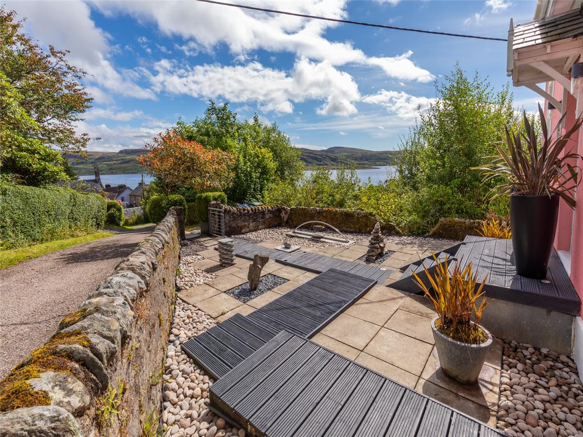 Via personal gate to low maintenance contemporary design gardens, all of which are laid to a combination of concrete slabs, timber decking, slate chips, and pebble stones, LED deck lighting and LED wall lights to assist and aid as evening lighting, there are various pieces of sculpture located around the front gardens, the side gardens are reached via a timber pathway which provide access to another personal gate and all of which is bounded by a retaining stone wall, from the gardens and its slightly elevated position there are wonderful views across the famous Kyles of Bute. Private vehicular parking is located in front of the property.