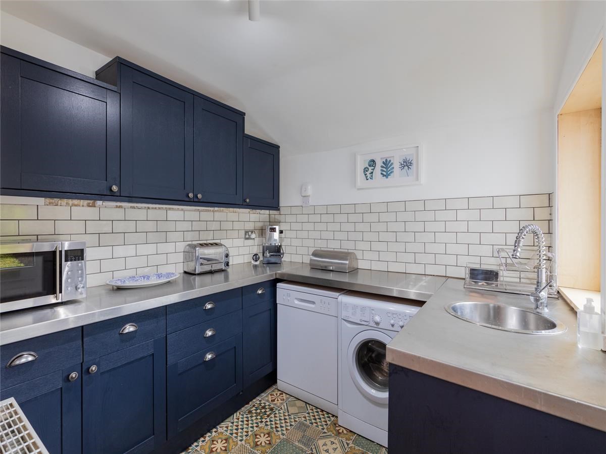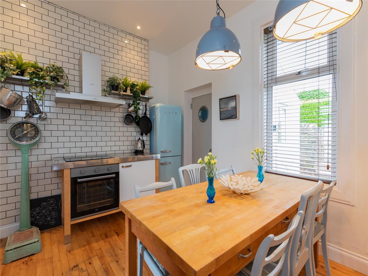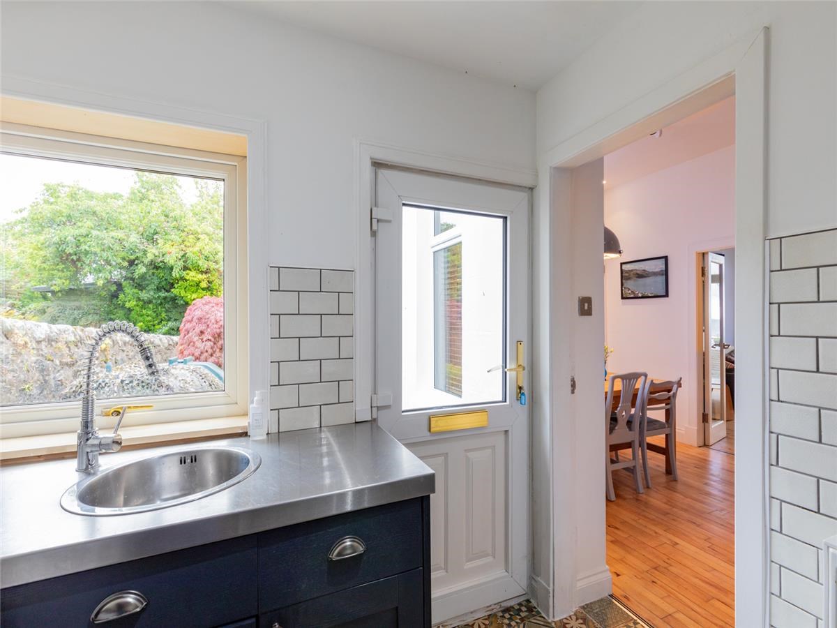 Outer front door with glass insert to vestibule housing the electrical switch gear, inner front door to welcoming entrance hallway, bedroom 1 (principal) with 2 x windows to gardens and sea views, bedroom 2 with window to gardens and sea views, fitted store cupboard, contemporary family bathroom with overhead shower, tiled flooring and LED colour lighting, heated towel rail, under stair toilet with heated towel rail, formal sitting room with ceiling rose and cornices, warming Morso multifuel stove with slate hearth, glazed French doors opening to outside decked terrace, twin leaf doors with glass insert to formal dining room with with freestanding Smeg fridge/freezer, electric oven, induction hob and extractor. Kitchen/Utility with Howden shaker style navy blue kitchen, washing machine, dishwasher, stainless steel worktops, with metro tiles above, window and door to gardens and side entrance.
