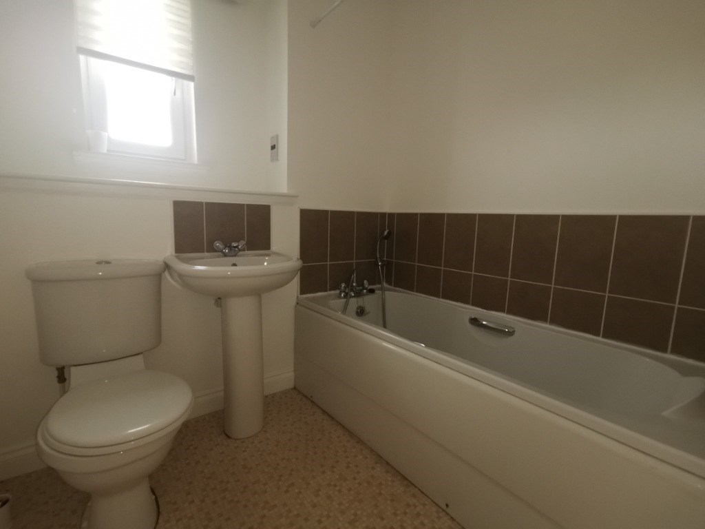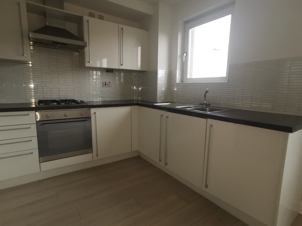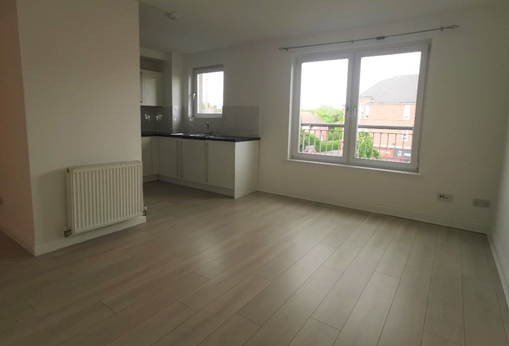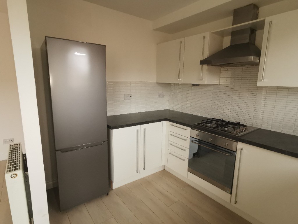The master bathroom has been fitted with a three piece white suite with over bath shower which runs from the mains water tap. Further benefits include partial tiled walls and lino flooring. The large open plan lounge/kitchen features light grey laminate flooring and freshly painted walls. The kitchen has been fitted with a variation of gloss white wall and base units with contrasting work tops. Appliances are included which consists of fridge/freezer, washing machine, gas hob and built in oven.