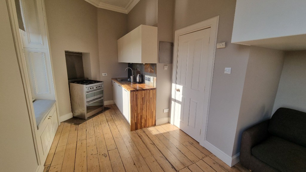 The property comprises entrance hallway with built-in storage and a shower room with WC off. The main room comprises lounge/bedroom area to one side and a fitted kitchen with excellent quality fixtures to the other. There are two double glazed traditional sash and case windows in the main room giving lots of natural light.