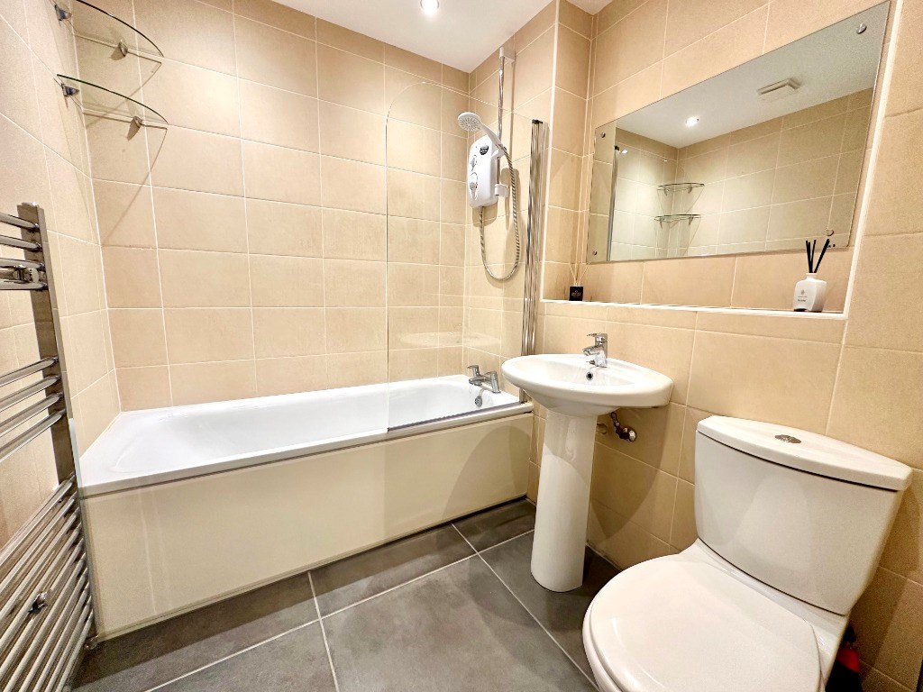 The fully tiled bathroom consists of a towel heater, toilet, sink and bath with electric shower overhead.