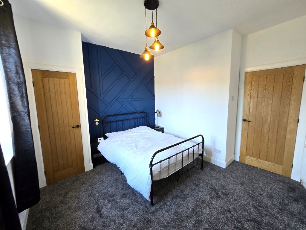 Large double bedroom with built in wardrobe and feature wall: Modern shower room with storage: Open plan kitchen, living, dining room with storage: Hall.