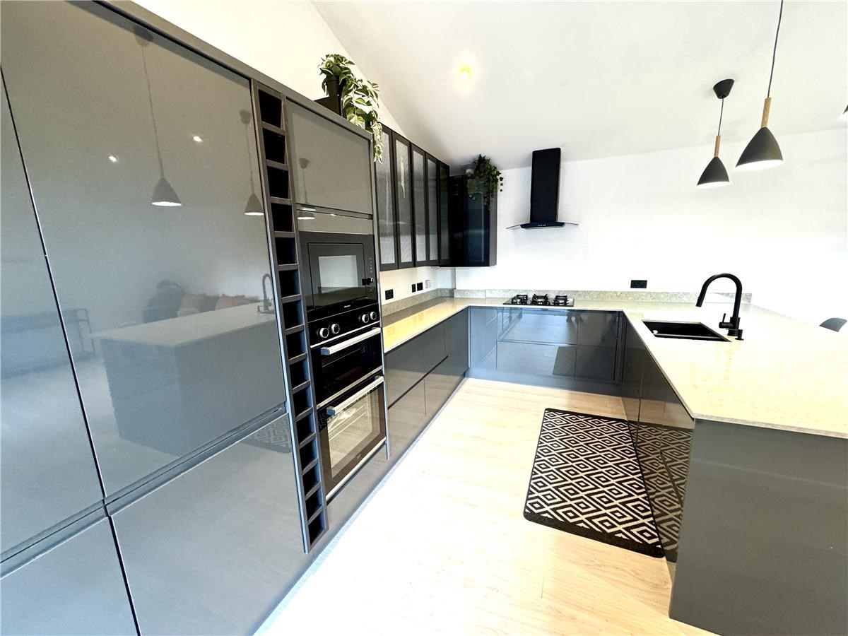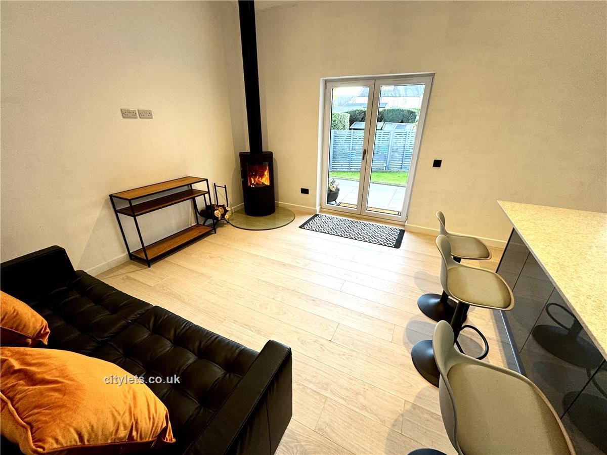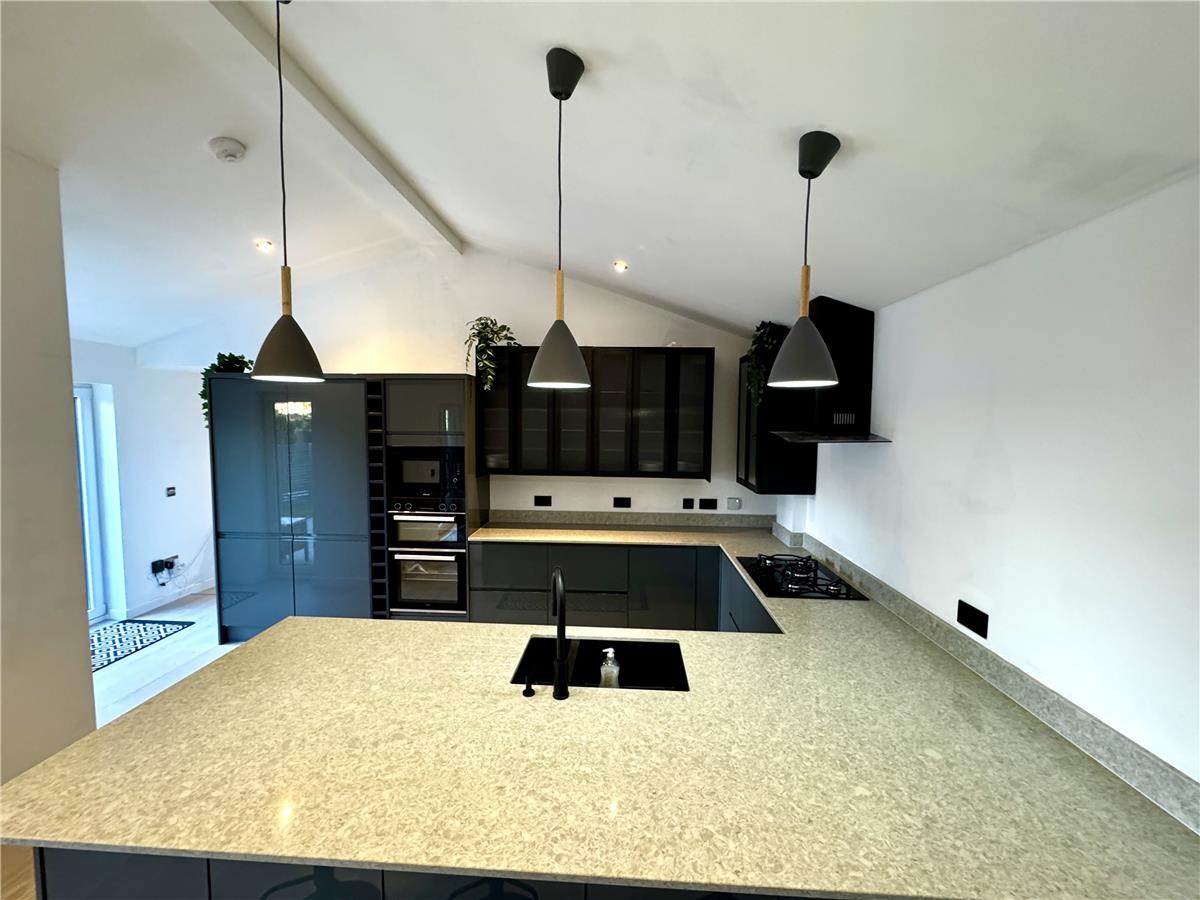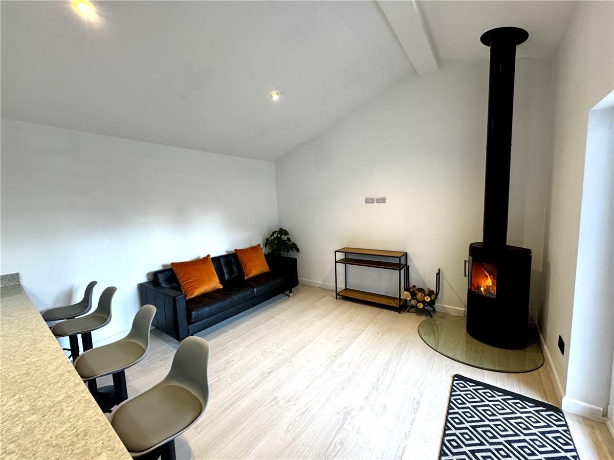 The open plan kitchen living area has a woodburning stove and underfloor heating. The new kitchen has a large quartz  breakfasting counter with stools, has a full size dishwasher, separate full size fridge and freezer, a double oven, a 5 burner gas hob and built in microwave. The living room is furnished with a leather 3 seater sofa and two armchairs with coffee tables and a TV table for a Freely TV which does not require a TV ariel but needs access to wifi.