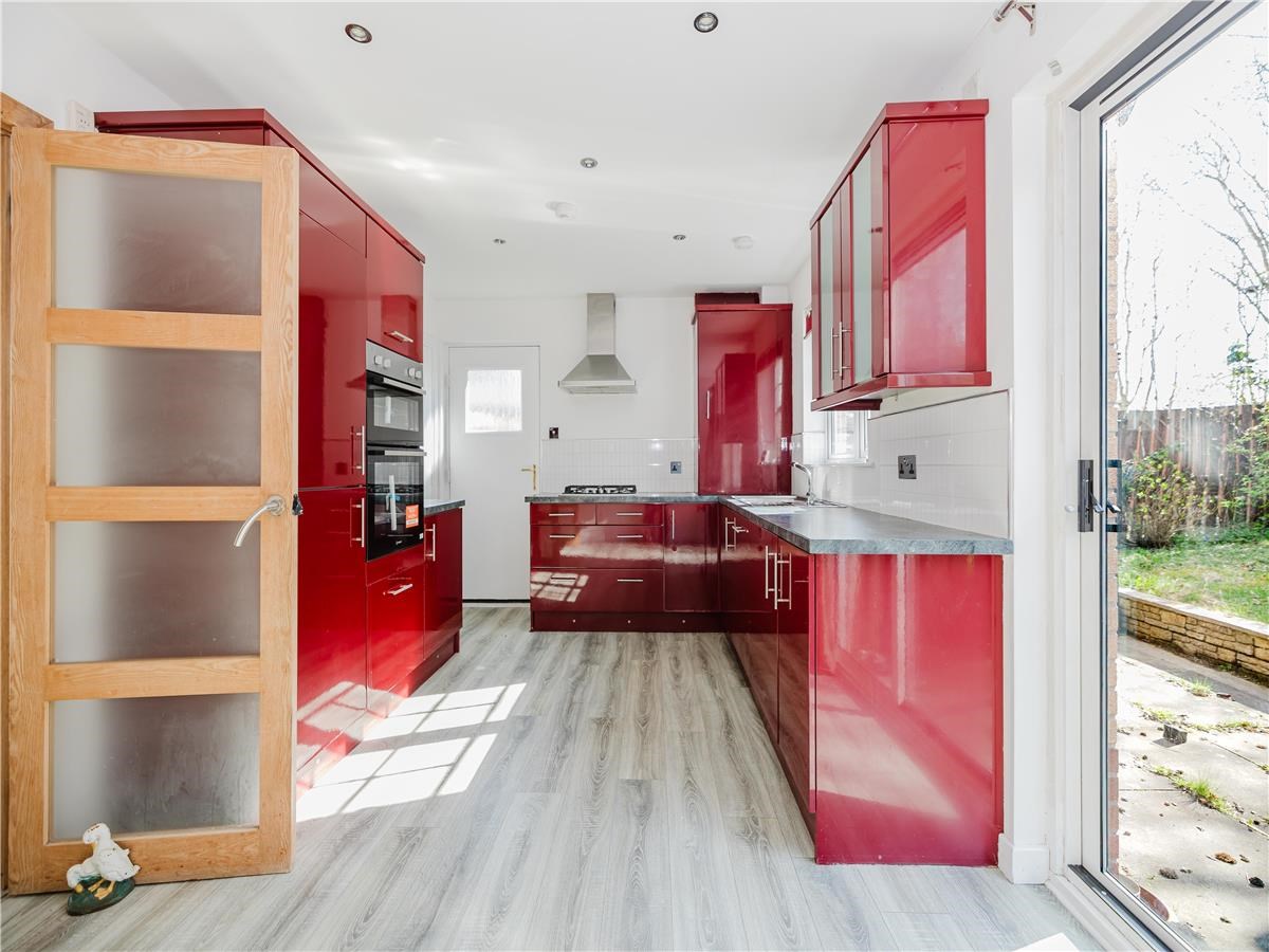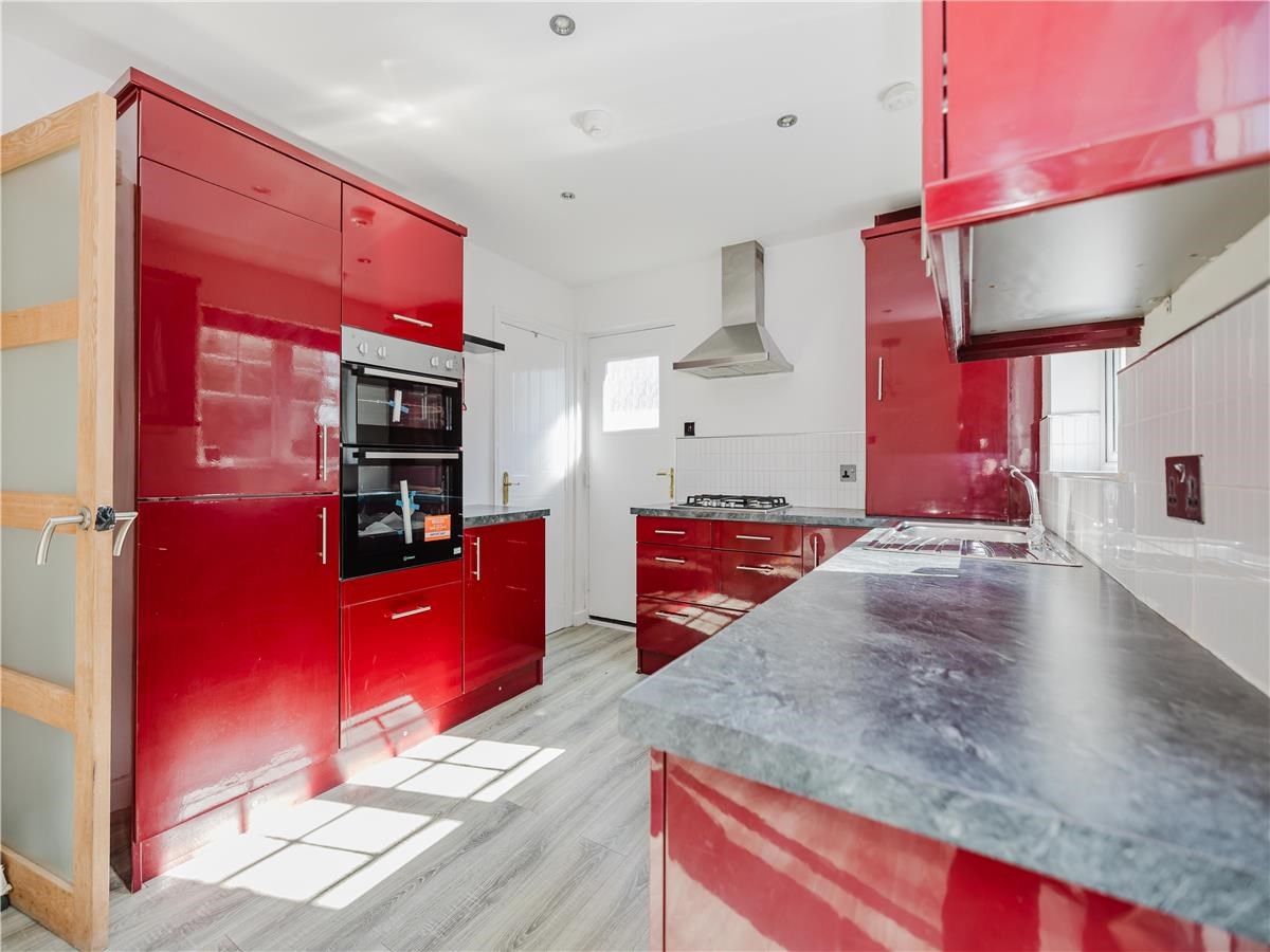 ~Very modern and well-equipped kitchen, off-lounge, with selection of integrated appliances and glossy red units