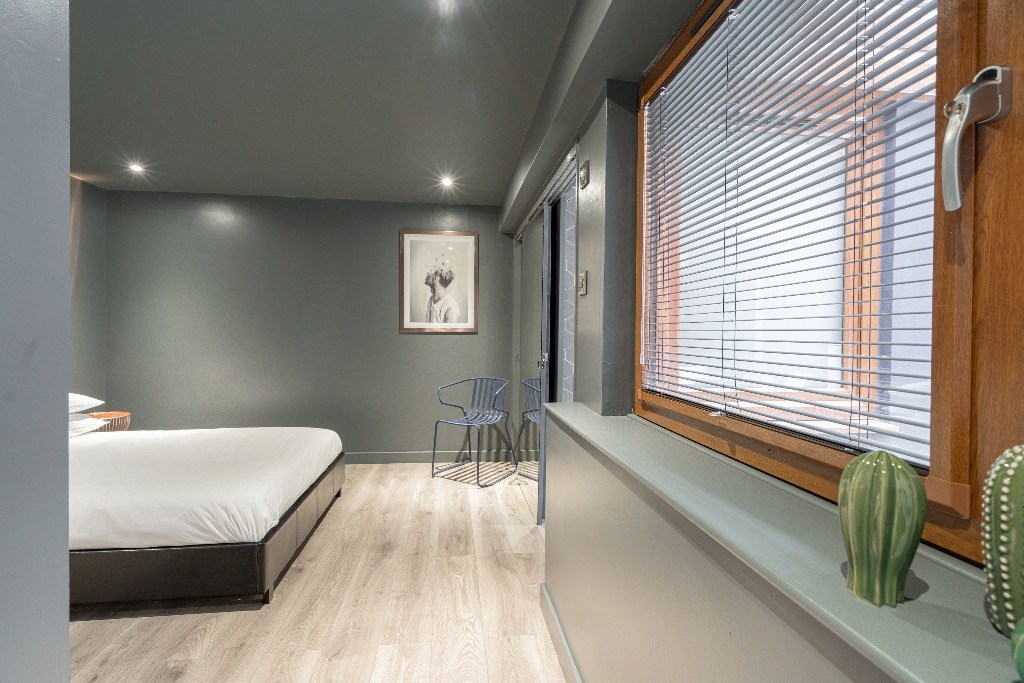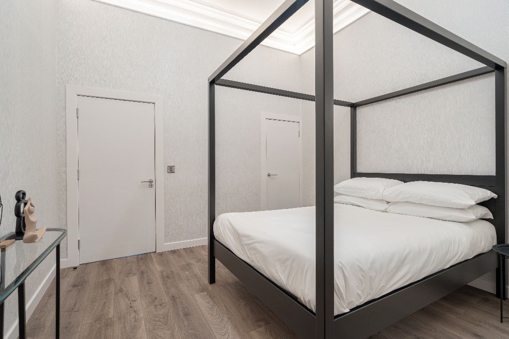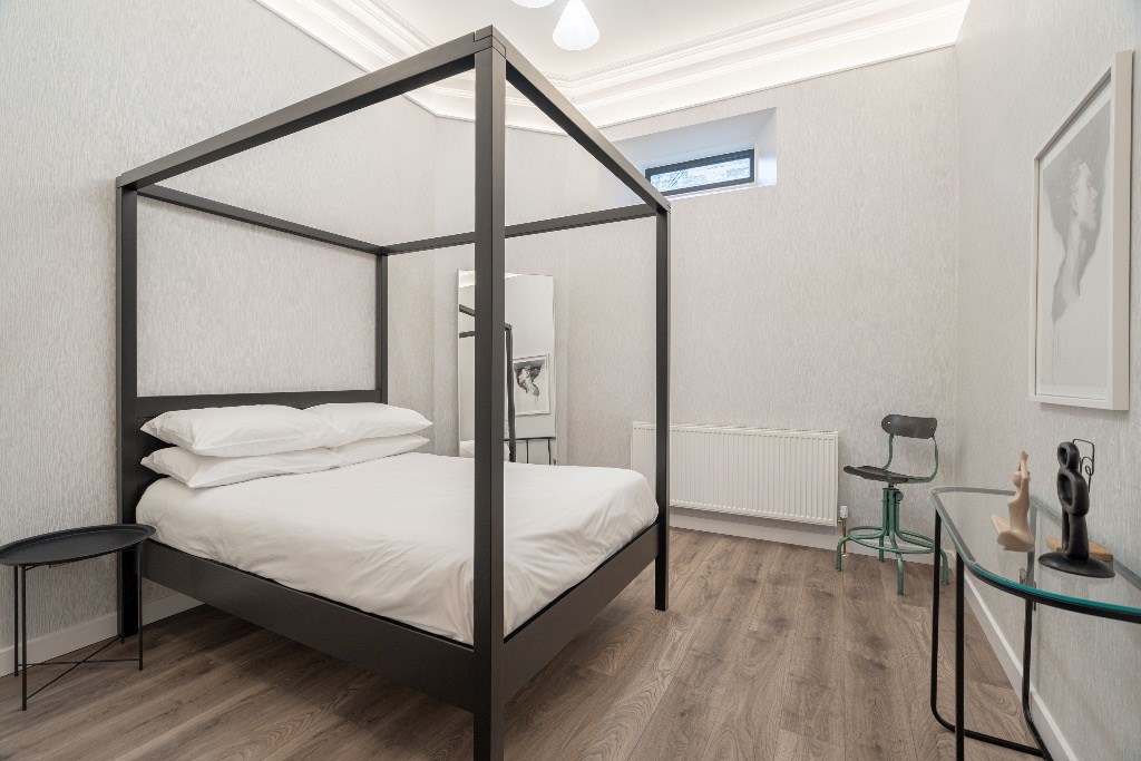 Lying peacefully off this space is a chic double bedroom adorned with a serene colour palette and featuring a walk-in cupboard.