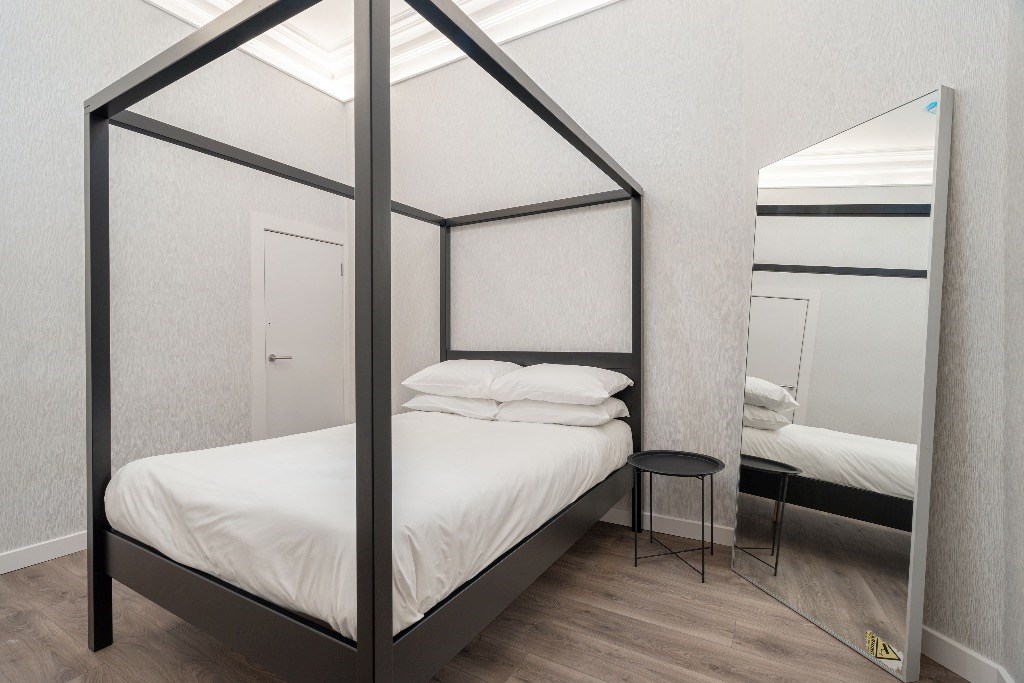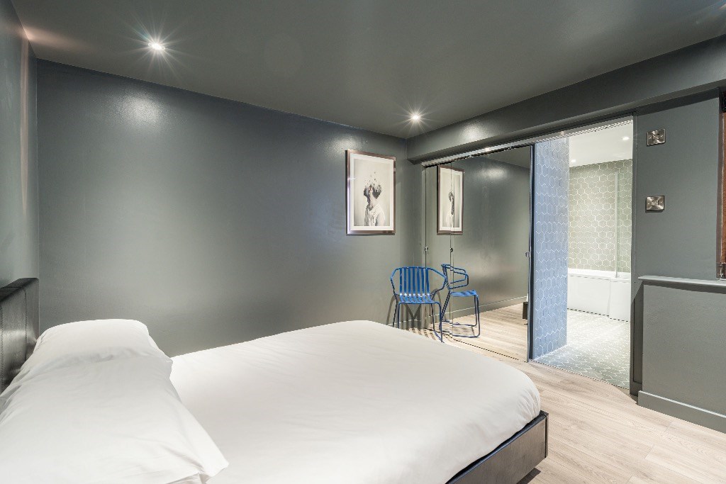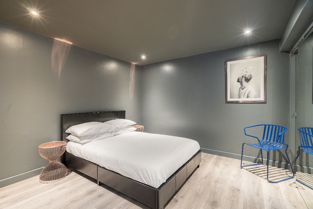 The bedroom with its soft downlighters, handsome wooden flooring and serene wall finishes offers a tranquil retreat. Its restful and luxurious ambience is further heightened by a stunning en-suite bathroom cleverly concealed behind sliding mirrored doors.