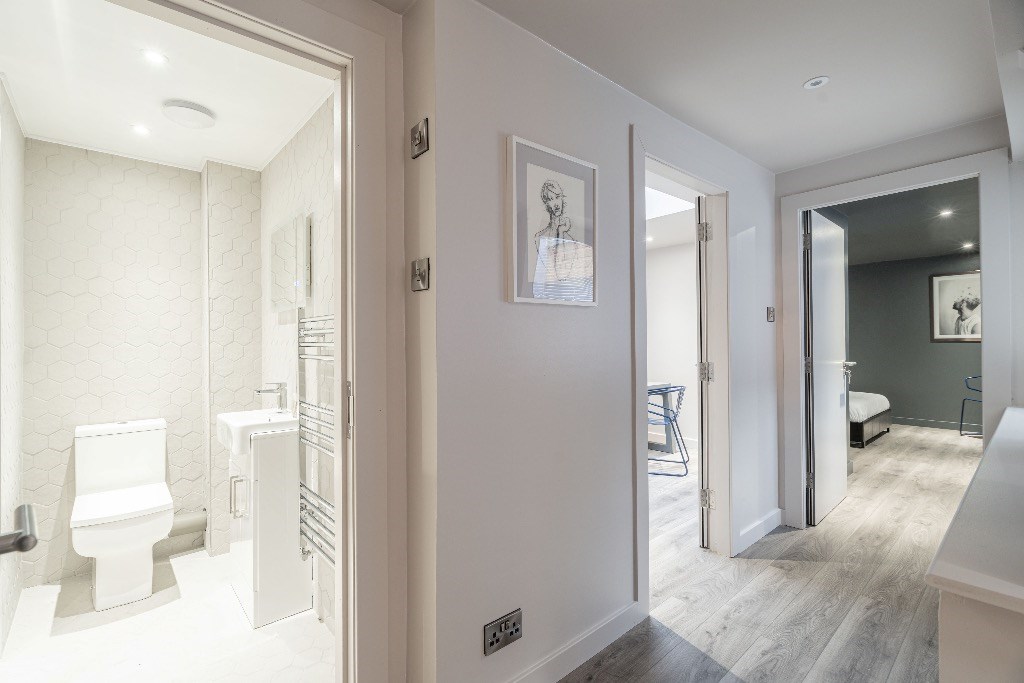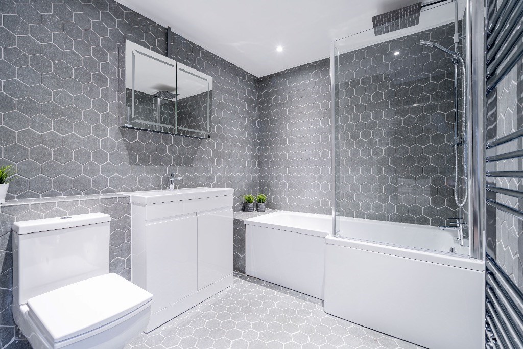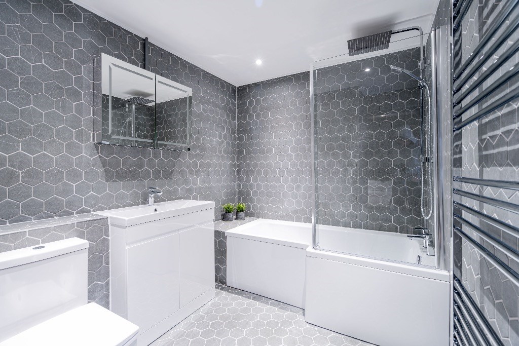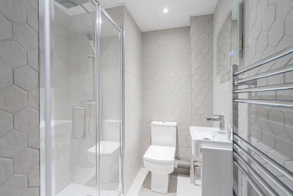 Upon entering this private sanctuary, you discover a pristine white suite comprising a bath with a wall-mounted rainfall shower, WC, washbasin built into vanity and chrome towel radiator, all set against contrasting dark and light grey geometric wall and floor finishes.