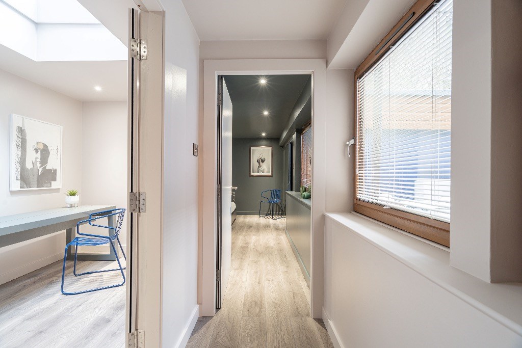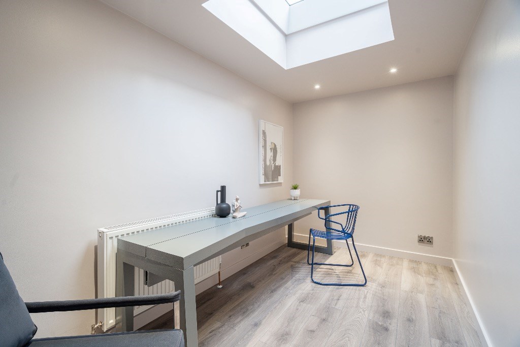 The home office provides a peaceful working environment and features an expansive skylight. Adjacent is an impressive shower room featuring a WC, washbasin built into vanity and chrome towel radiator laid out against a backdrop of matt grey hexagonal tiling.