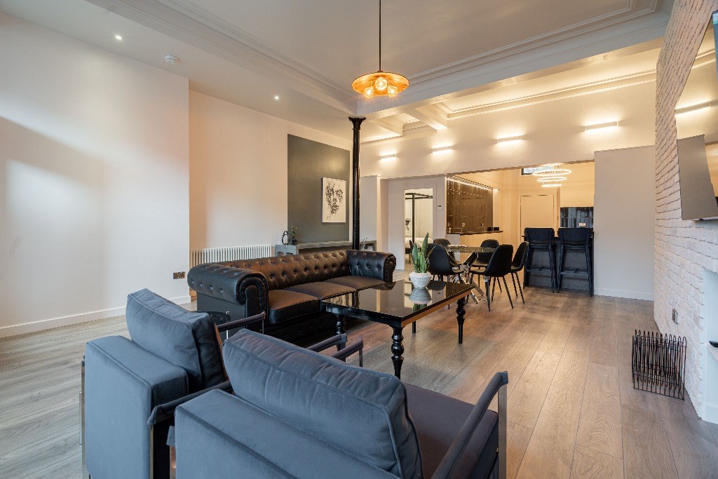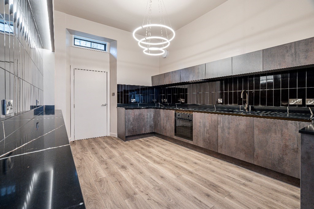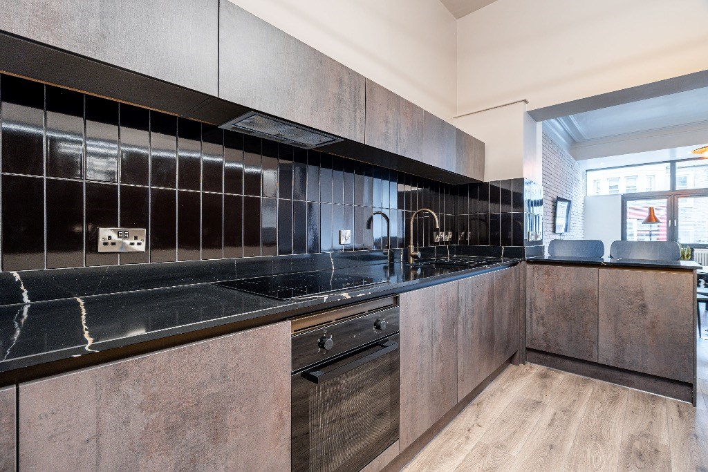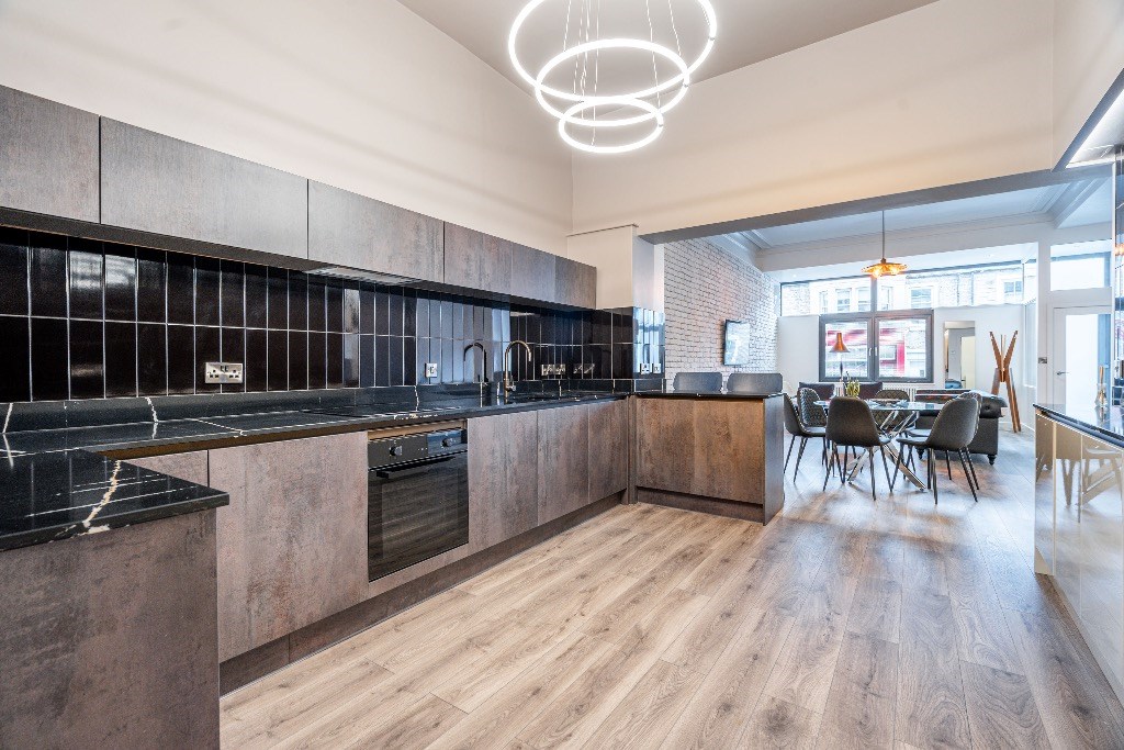 Towards the rear, the sizeable kitchen showcases a tasteful design-led approach. With handleless wall and floor units in a burnished natural hue and cream, sleek black marble worktops and a gloss black tiled splashback it embodies the perfect blend of style and functionality. High-spec integrated appliances include an oven and hob whilst a breakfast bar sits two comfortably.