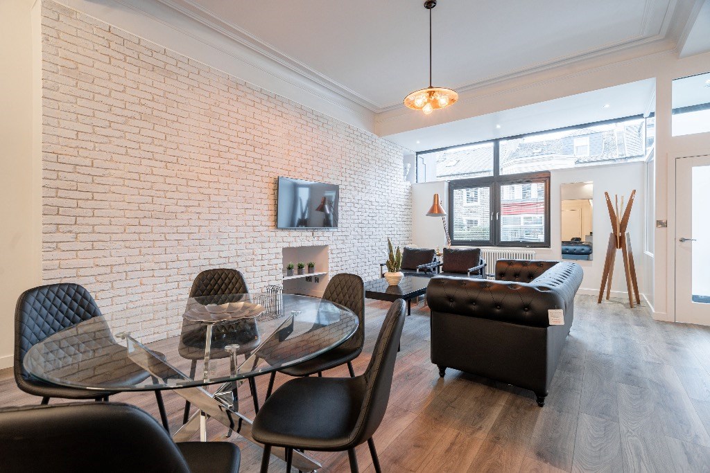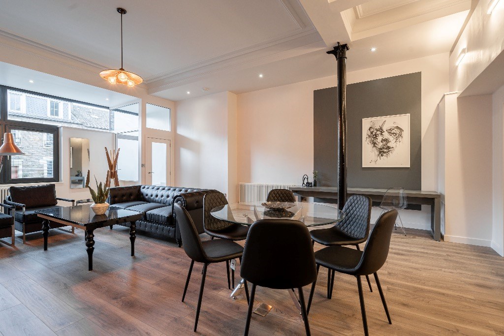 From a small, gated patio bordered by decorative stones, the front door opens straight into a spectacular open living kitchen. Boasting exposed brickwork, handsome wooden flooring, ambient up-and-down wall lighting, and a vertical radiator the atmosphere is one of refined urban sophistication that carries throughout the whole residence. The abundance of natural light from the front-facing windows along with the high ceilings enhances the overall feeling of modernity, openness, and space.