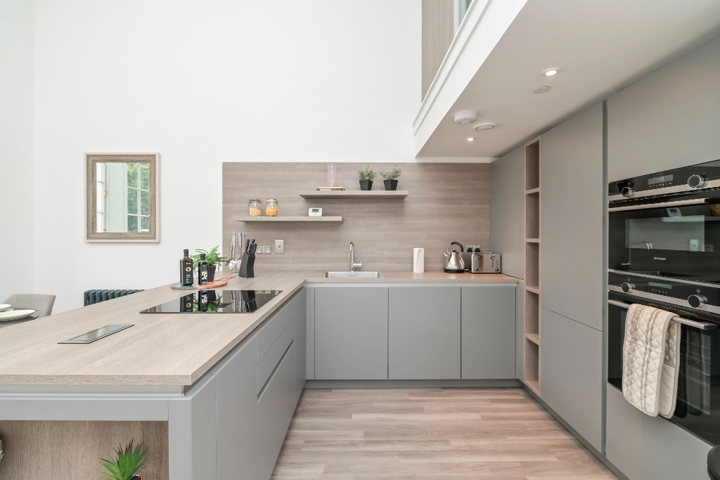 Internal accommodation on the ground floor comprises the stunning bright south-westerly facing open plan living area, which benefits from a stunning 4.5 metre ceiling. High-quality kitchen designed by Kitchen International with Siemens integrated appliances including dishwasher, oven, combination microwave and 5 ring induction hob.
