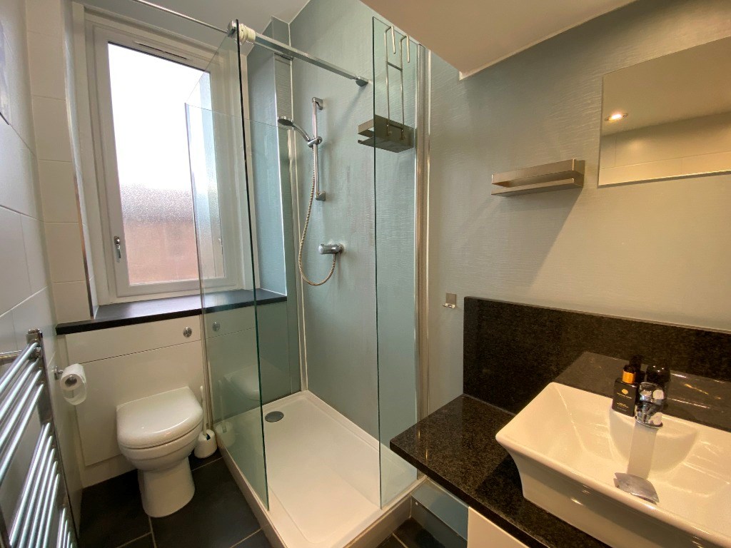 The shower room has a large walk in shower, toilet and sink with storage underneath. There is a large frosted window allowing for both light and privacy. There is a heated towel rail.