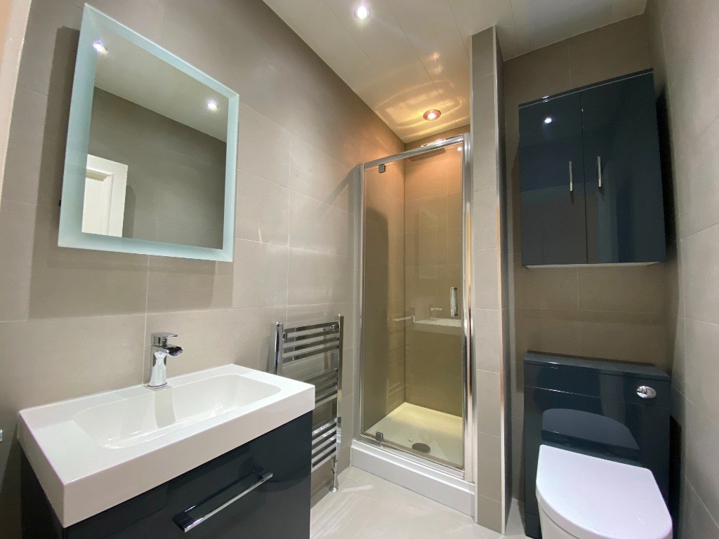 The larger of the two bedrooms has room for a double bed, built in large wardrobes on either side of the room and built in desk. This bedroom has access to an en-suite that comes with a toilet, shower cubicle, sink with storage underneath and LED light mirror. There is an additional storage cabinet and the en-suite is tiled throughout, making it easy to clean and maintain. The bedroom has a window overlooking the shared garden.