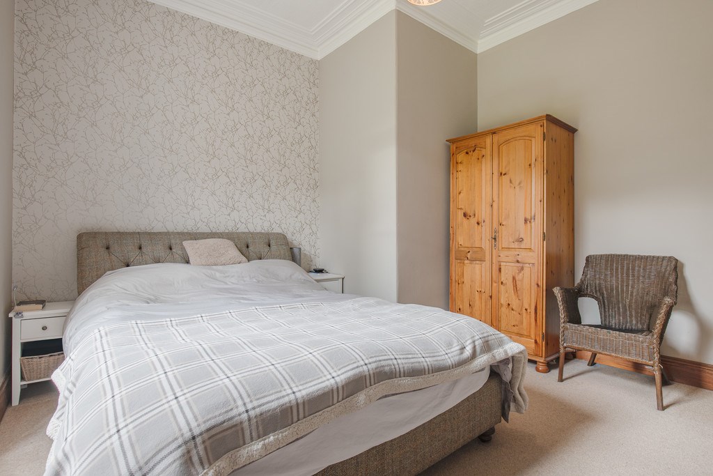 BEDROOM 1 This bedroom is a bright and serene space with a soft neutral palette, combining comfort and classic charm. It features a tufted upholstered bed with matching bedside tables, a warm wooden wardrobe, and a cosy wicker chair. A delicate feature wall adds subtle elegance, while a large sash window fills the room with natural light. Finished with a tall ornate mirror and soft carpeting, the room offers a peaceful and stylish retreat.