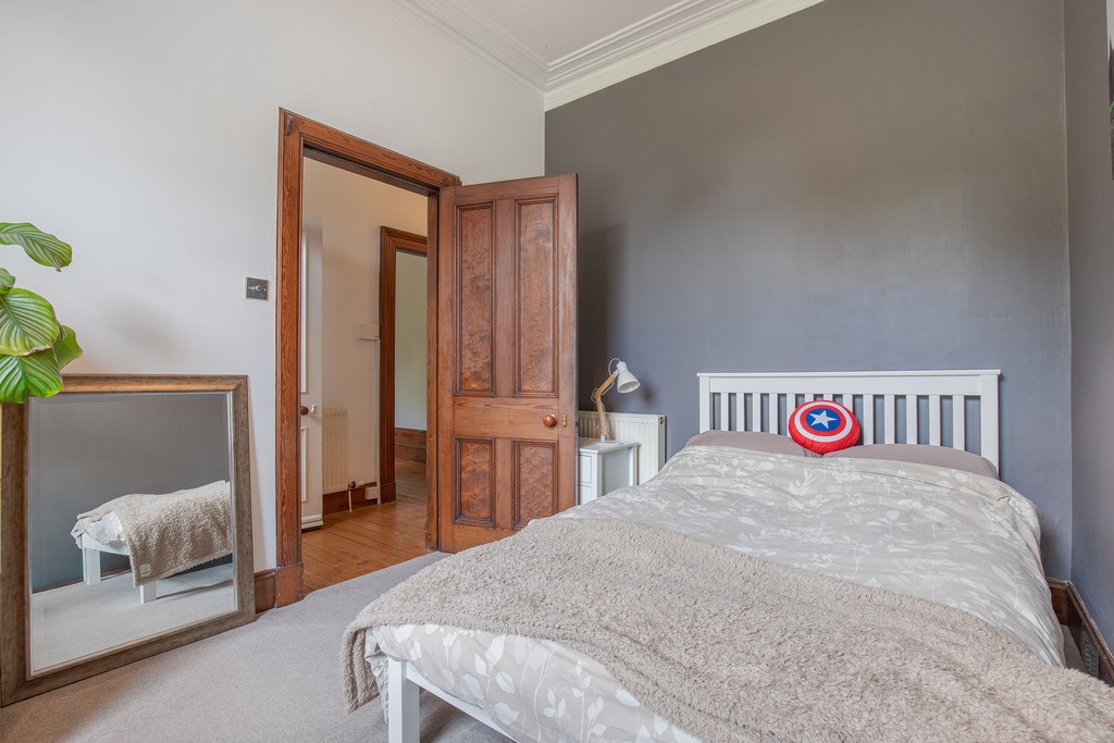 BEDROOM 2 This second bedroom is a stylish and functional space, perfect for a guest room, teenager, or student. It features a white framed bed set against a bold charcoal accent wall, paired with soft bedding and a cozy throw. Warm wood elements, including the door frames, skirting, and built-in storage, add character and depth. A large sash window with original wood panelling brings in ample natural light and offers a pleasant street view. The room also includes a compact white desk and office chair, making it ideal for studying or working from home.