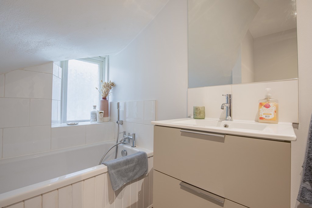BATHROOM This recently renovated bathroom is a sleek and modern space, thoughtfully designed for both style and functionality. It features a clean, neutral palette with soft white walls and light grey flooring, creating a bright and airy feel. The room includes a full bathtub set under a sloped ceiling with a frosted window that provides privacy while allowing in natural light. There's also a separate glass-enclosed shower with large grey wet wall effect tiles and a rainfall showerhead, offering a luxurious, spa-like experience. A modern vanity unit with integrated sink and a large mirror maximizes storage and space, while a sleek toilet is positioned neatly beside the shower. Thoughtful touches like decorative accents and a niche for bath storage under the tub add charm and practicality.