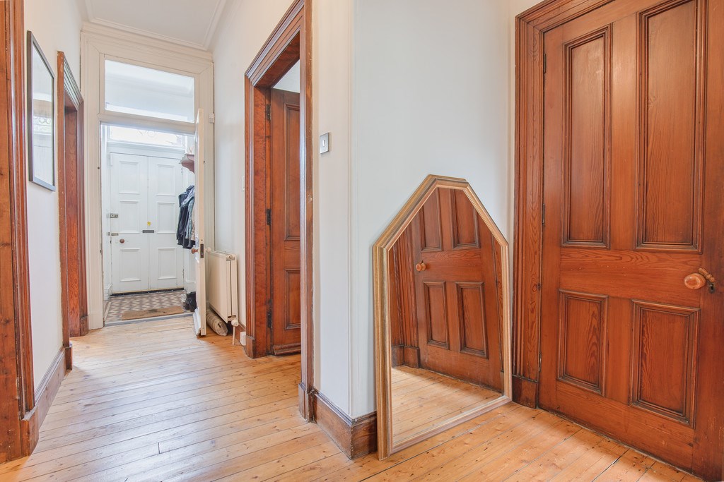 HALLWAY A private front door with fanlight opens into a bright vestibule laid with original Victorian-style mosaic tiles, perfect for coats and shoes. An inner door leads to the generous reception hall with high ceilings and polished timber floorboards. Throughout, the original pitch-pine woodwork and panelled doors add warmth and character. The hall provides access to all principal rooms and benefits from practical storage, including a useful full size storage cupboard, plus space for a console or hall furniture and a radiator for cosy arrivals.