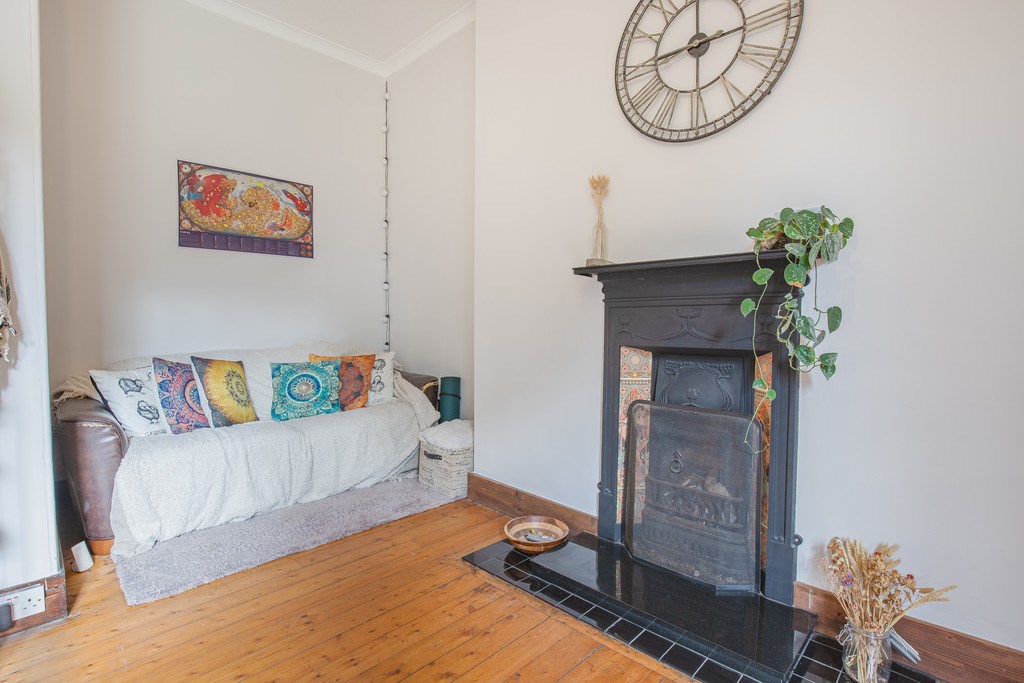 SECONDARY LIVING/HOME OFFICE/ DINING ROOM This versatile room combines a secondary living area, dining space, and potential home office in a bright and inviting setting. It features warm wooden floors, neutral walls, decorative fireplace and a blend of vintage and modern decor. A rustic-industrial dining table by a large window doubles as a workspace or game area. The cosy seating nook with vibrant cushions and a unique art piece adds charm, while a cast iron fireplace and wall clock bring character. A chalkboard wall and bookshelf enhance its functionality, making it ideal for relaxing, working, or casual entertaining.