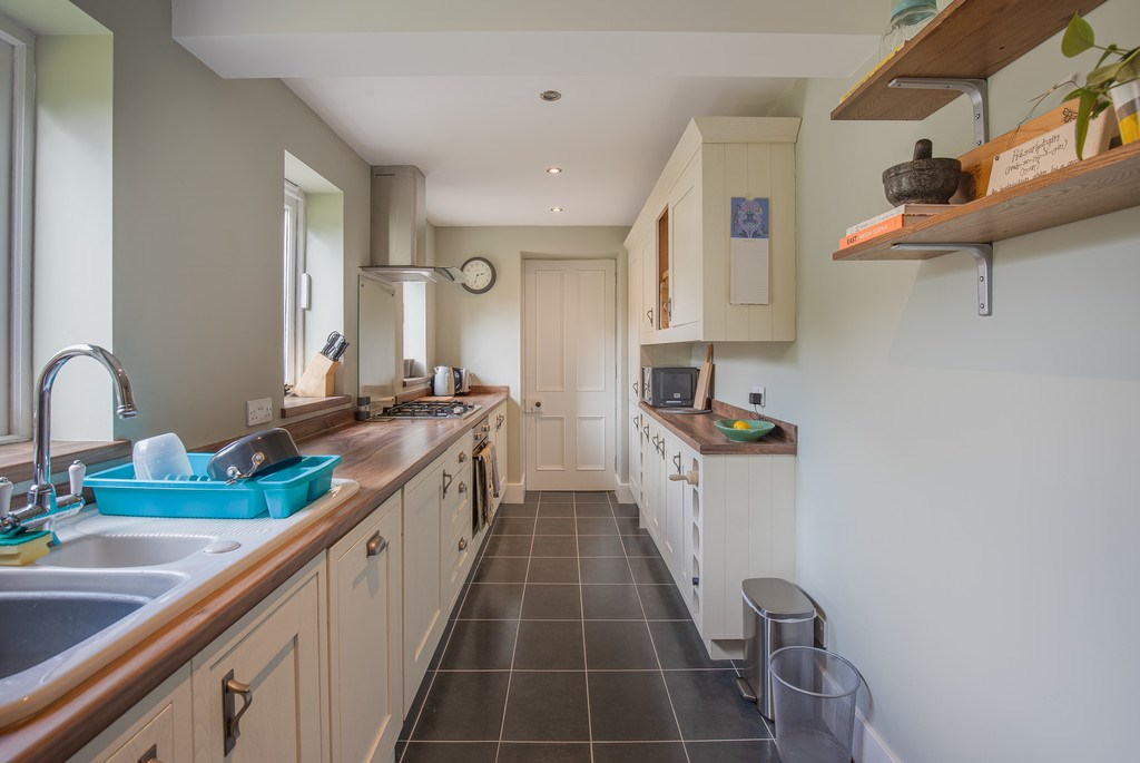 KITCHEN This charming galley-style kitchen is both practical and stylish, featuring a smart layout with ample natural light from dual-aspect windows. It is fitted with shaker-style cabinetry in a soft cream finish, complemented by warm wooden countertops and sleek tiled flooring. A five-burner gas hob with a modern stainless steel extractor hood is set against a glass splashback, with an integrated oven positioned below for efficient cooking. Additional features include a stainless steel sink with a drainer, open shelving for characterful storage, a built-in microwave area, and free standing washing machine. The room benefits from spot lighting and a contemporary vertical radiator, adding both warmth and a touch of modern design. From the kitchen, a door leads directly out to the well-kept shared back garden.