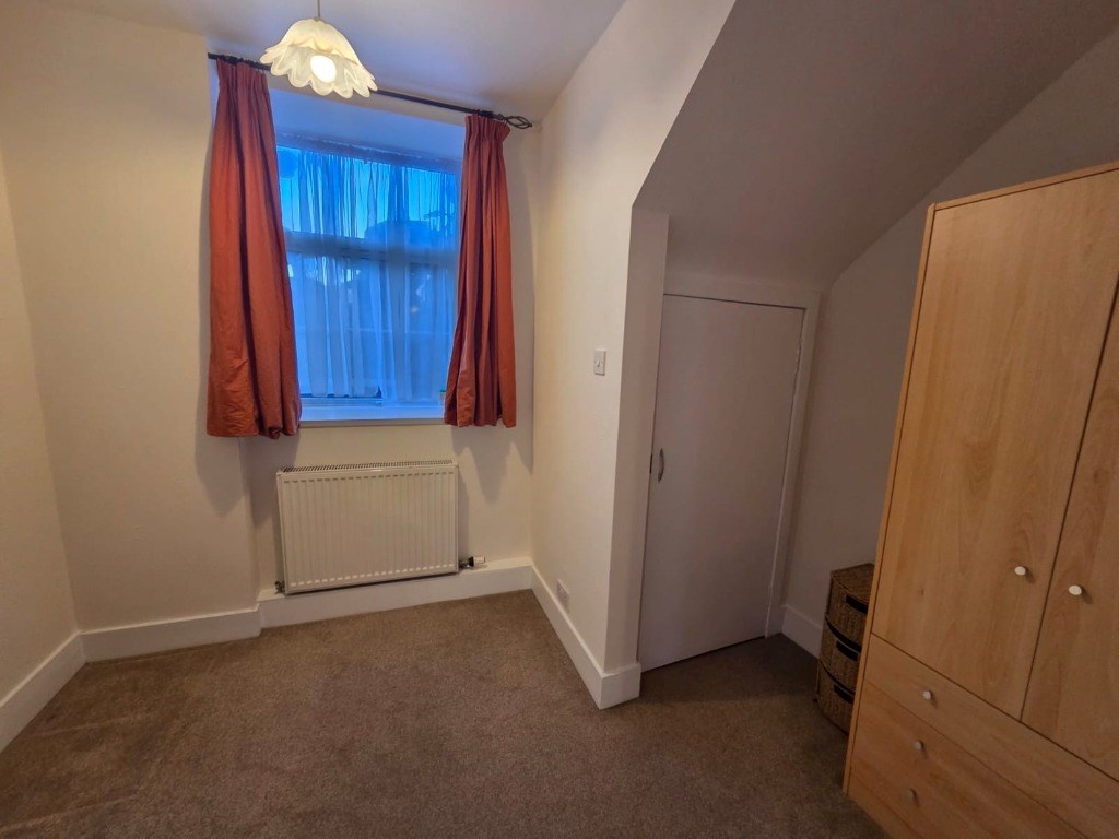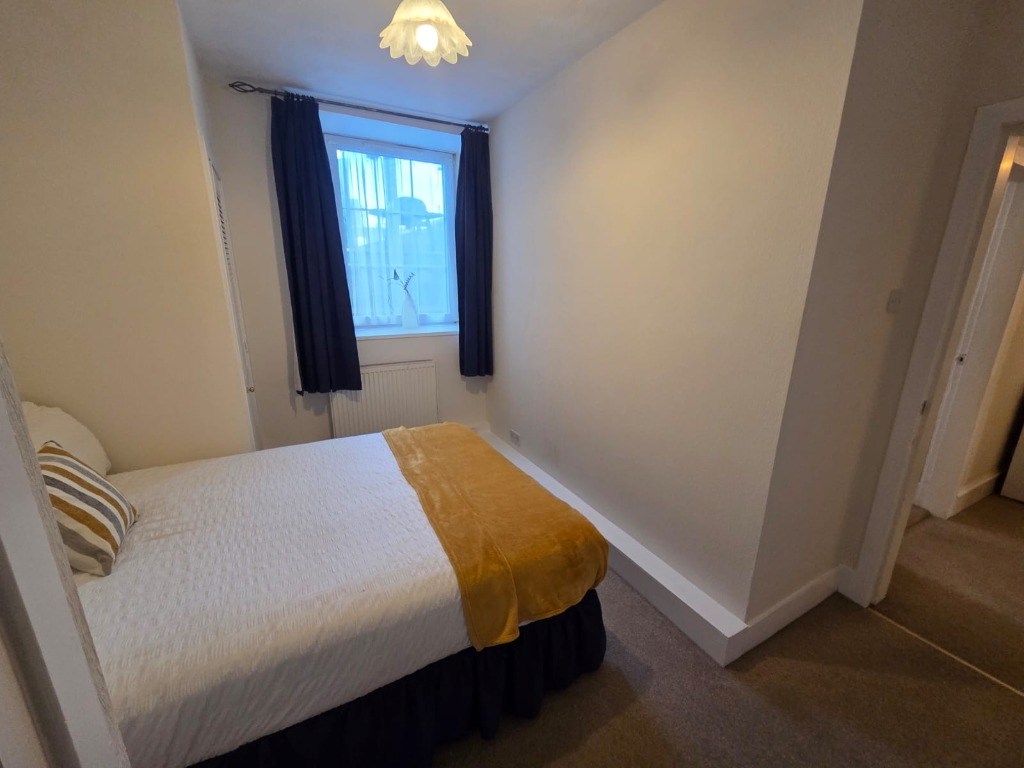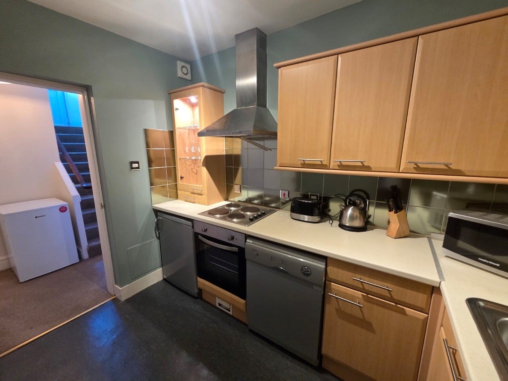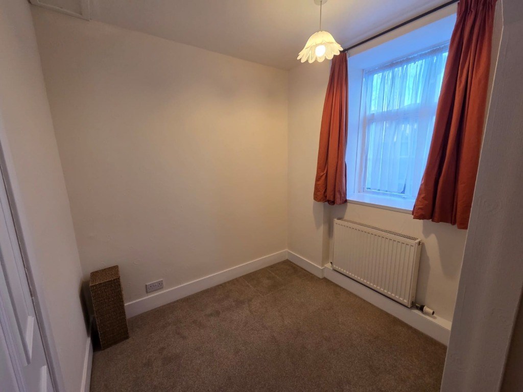 Situated on the lower ground floor, this apartment has its own front and back doors and a carpeted hallway which gives access to all rooms. The lounge area is bright and sunny and has a leather sofa suite and a wooden dining table and chairs. There is also a decorative fireplace feature which adds a period-style focal point to the room. Further on, there is a shower room containing a shower cubicle, tiled flooring and a large mirror. The spacious double bedroom offers all the creature comforts of home with fitted wardrobes and storage space. There is a second room with a free standing wardrobe which could be a study or a second bedroom. To the rear of the property is the kitchen with tiled walls, cream worktops, wooden kitchen units and it’s equipped with all the usual appliances including a fridge, freezer, dishwasher, electric hob, oven and washing machine.