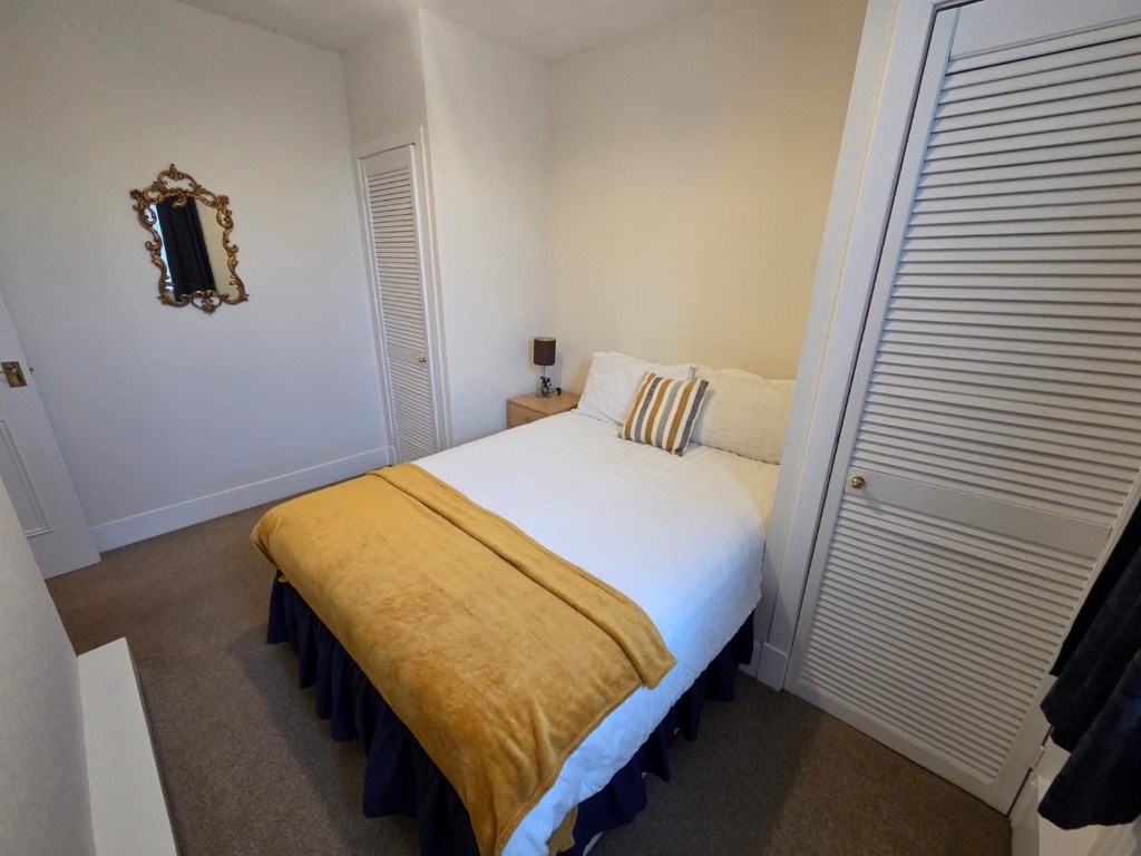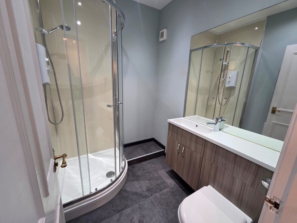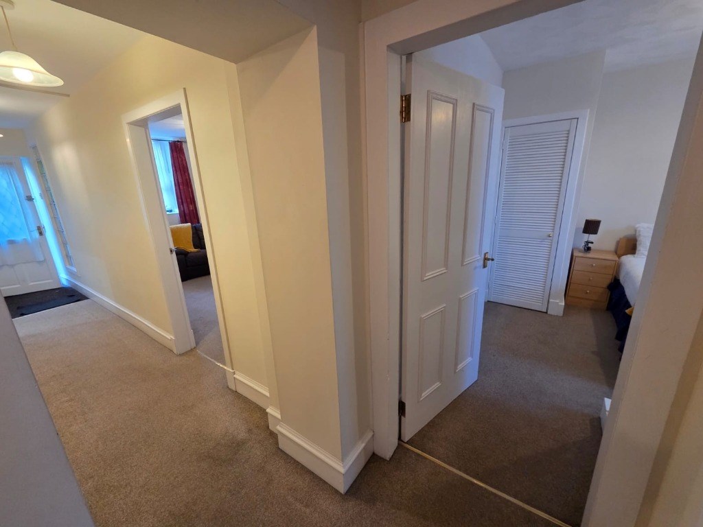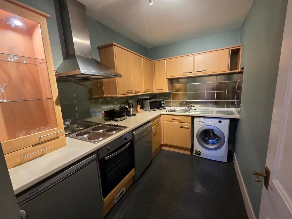 Situated on the lower ground floor, this apartment has its own front and back doors and a carpeted hallway which gives access to all rooms. The lounge area is bright and sunny and has a leather sofa suite and a wooden dining table and chairs. There is also a decorative fireplace feature which adds a period-style focal point to the room. Further on, there is a shower room containing a shower cubicle, tiled flooring and a large mirror. The spacious double bedroom offers all the creature comforts of home with fitted wardrobes and storage space. There is a second room with a free standing wardrobe which could be a study or a second bedroom. To the rear of the property is the kitchen with tiled walls, cream worktops, wooden kitchen units and it’s equipped with all the usual appliances including a fridge, freezer, dishwasher, electric hob, oven and washing machine.