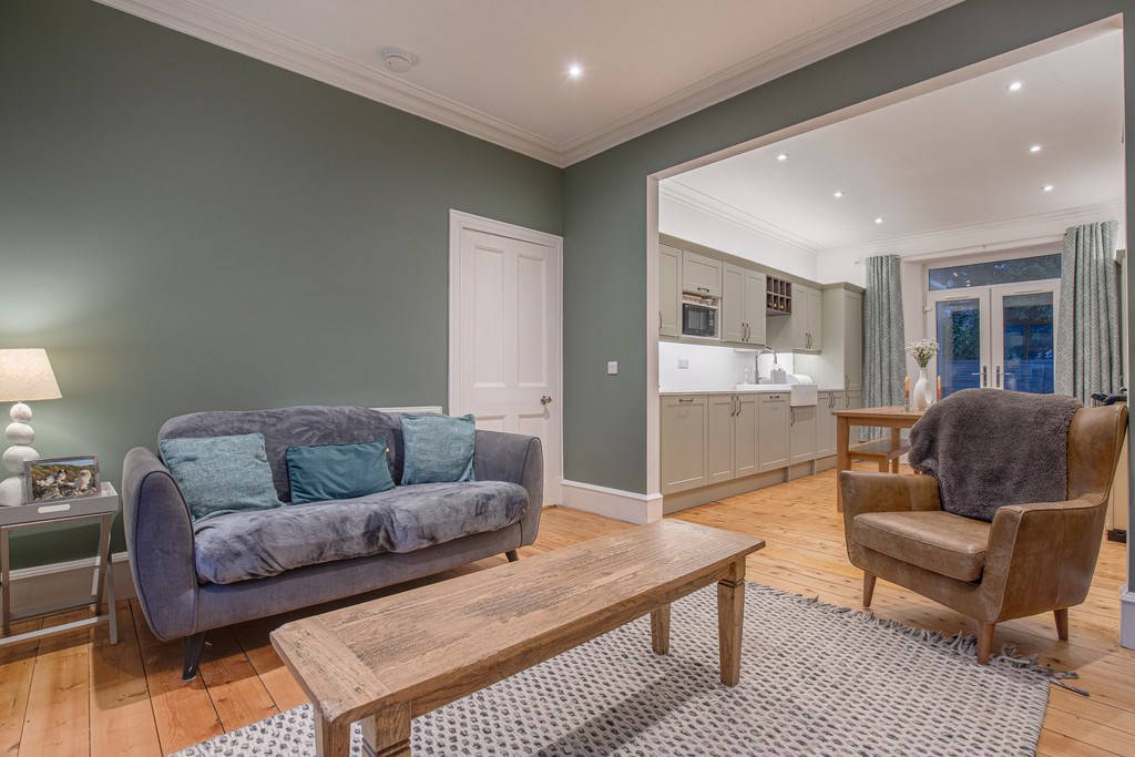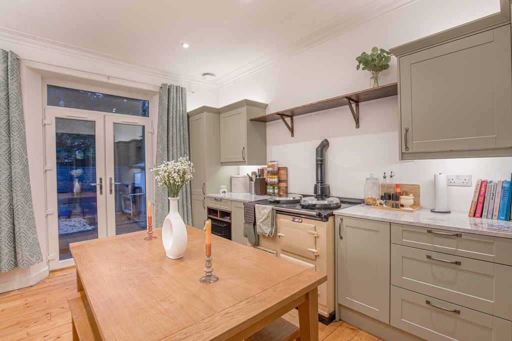 KITCHEN Connected to the living space for this property, the kitchen area is very eye-catching blend of traditional and modern styles. With smooth grey marble countertops and a fascinating 4-door AGA oven cooker, this kitchen space is the ideal area to prepare and enjoy all of your favourite meals. This kitchen also provides access to the back garden.