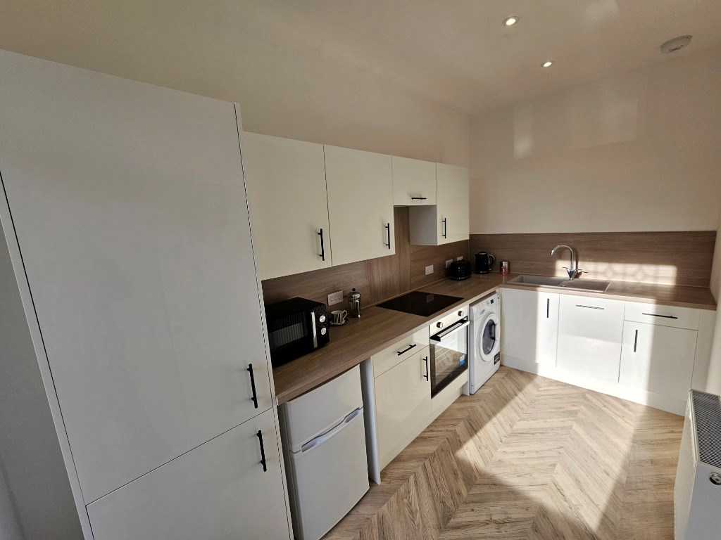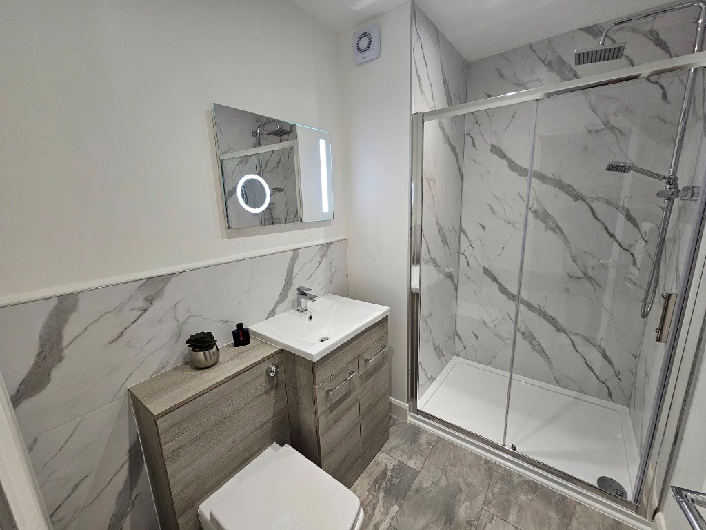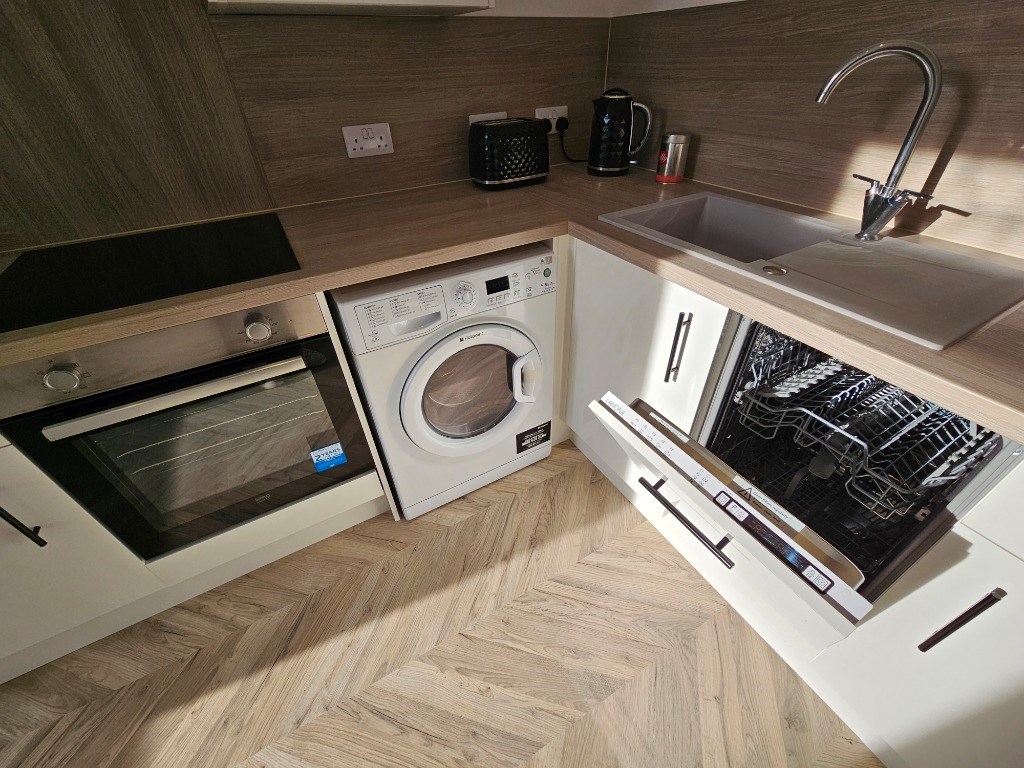Spacious dining kitchen with ample storage and dishwasher: Livingroom: Double bedroom with storage: Modern Shower: Hall.