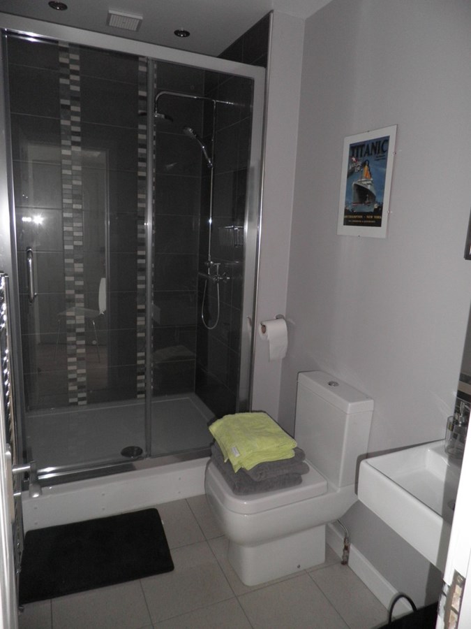 BATHROOM Modern three piece white suite with double shower cabin and dark tiles.