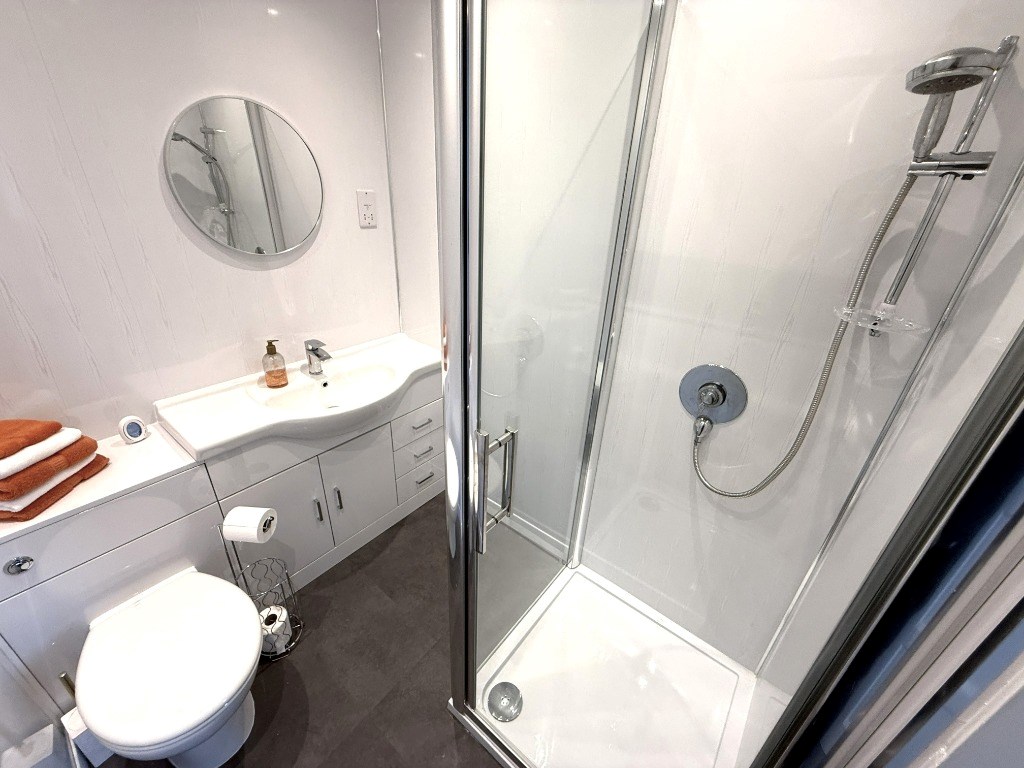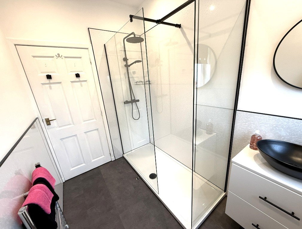 The accommodation comprises: stunning lounge space to the front of the property, with large front window allowing for lots of light; modern kitchen with space for dining, a range of storage thanks to the wall and floor units, a range of appliances, large storage cupboard, and direct access to the rear garden; 2 lovely double bedrooms with storage both built in an provided; one has en suite shower room with white suite and fully enclosed shower area; further shower room downstairs with white suite and large shower enclosure.