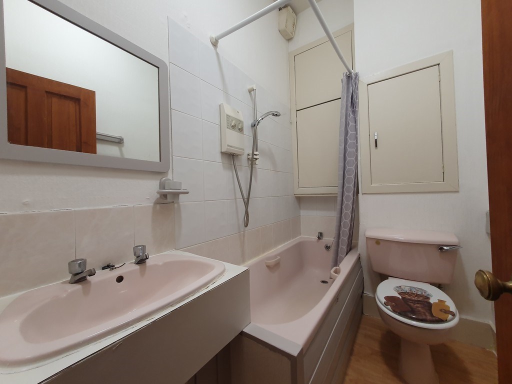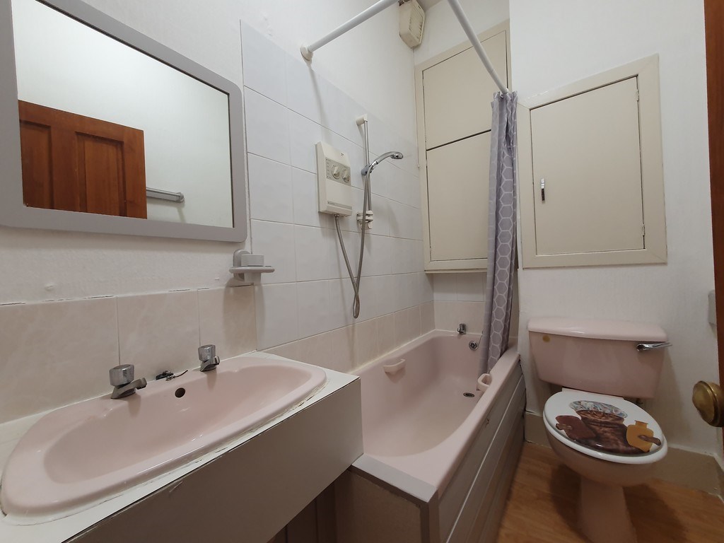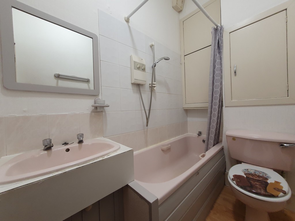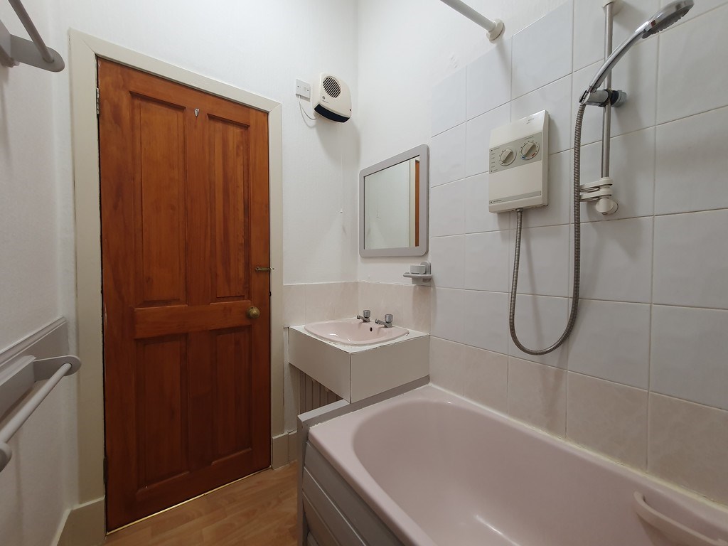 BATHROOM Three-piece suits with electric shower over bath. White tiled surround and laminate flooring complete this room.