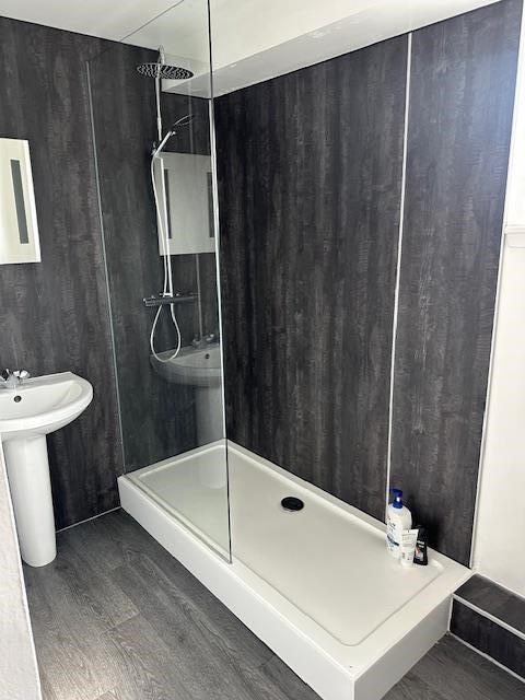 * Bathrooms: 2 modern bathrooms each with shower cubicle, sink, and toilet.